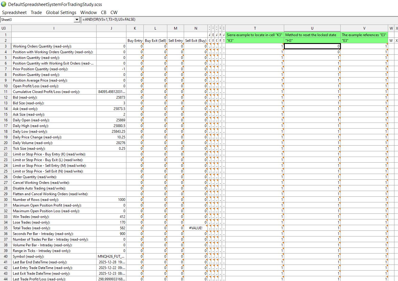 There are three cell references in the Sierra Chart example above. I have transposed those cells as follows; Sierra Chart K3 = My spreadsheet's T3 Sierra Chart H3 = My spreadsheet's U3 Sierra Chart E3 = My spreadsheet's V3 There are two formulas in the Sierra Chart Example which I transposed to the columns I am using in my spreadsheet; Formula #1 Sierra's version =OR(E3=10,K3>0) My version =OR(V3=10,T3>0) Formula #2 Sierra version =AND(OR(E3=10,K3>0),H3=FALSE) My version =AND(OR(V3=10,T3>0),U3=FALSE) There is one change that I made in my formula before I put it into my spreadsheet. Instead of using the number “10”, I am using the number “1”. Therefore, the actual formulas in my spreadsheet are as follows: Formula #1 Sierra's version =OR(E3=10,K3>0) My version =OR(V3=1,T3>0) Formula #2 Sierra version =AND(OR(E3=10,K3>0),H3=FALSE) My version =AND(OR(V3=1,T3>0),U3=FALSE) In cell V3 I have entered “=1”. The column U in my spreasheet continuously turns from 1 to 0 to 1 to 0, over and over. I have attached a PDF with colors showing the cell transposition, and a video that shows the cells going back and forth from 1 to 0. Date Time Of Last Edit: 2025-12-29 21:04:34