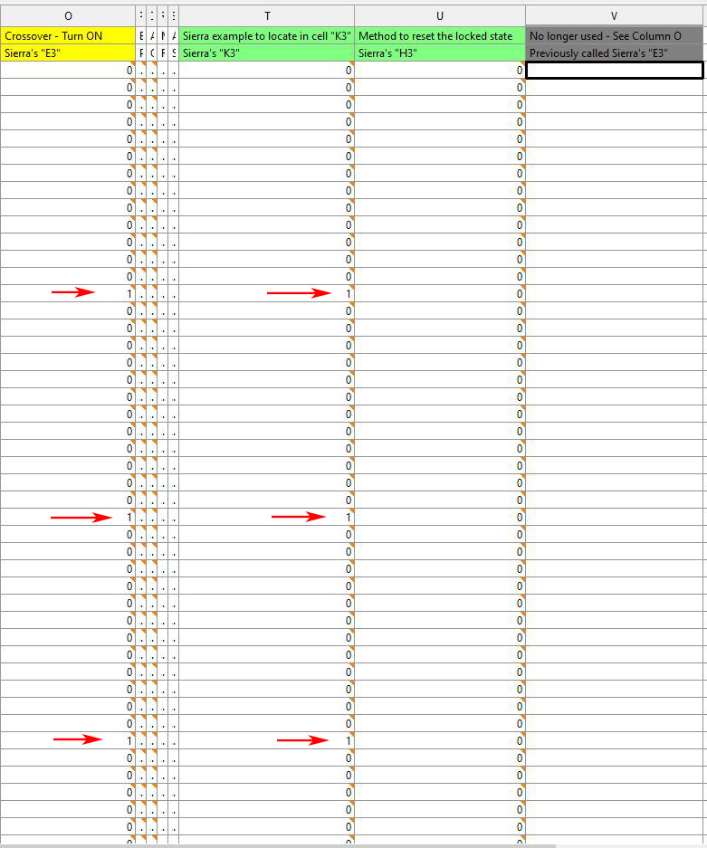 Sawtooth - "An easier way to do what you want is by creating a persistent TRUE variable in a Formula Column, using two IF statements, like this in W3: =IF(IndicatorCrossover,1,IF(OR(TradeEntry,2ndIndicatorTRUE),0,W4))" That is actually similar to how I started. When I could not get it to work as intended I went to the Sierra Help section. I have changed my spreadsheet so that Sierra's "E3" reference has been now replaced with my crossover trigger column, which in my spreadsheet is Column O. In this screenshot Sierra's "E3" is represented by my cell "O3". I have red arrows where there was a crossover event that produced a 1 in column O. Sierra's K3 does produce a 1 in that same row, but it is not staying as a 1. Attached is a screenshot of how Sierra's formulas are resulting. One of those two columns highlighted in green (presumed Sierra's K / my T) should stay as a "1" after the initial Crossover. Column U in my spreadsheet is assumed to be the latch reset condition. I have it exactly as Sierra's example, but with the cell names changed. =AND(OR(O3=1,T3>0),U3=FALSE) . But even if I delete all content in cell U3, it does not change anything in Column T. I will keep messing with it |