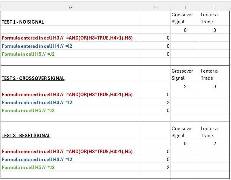 Locking a cell TRUE doesn't require the use of a Formula Column, since Formula Columns auto-populate across all bars.The idea is you would reference $H$3 in your K3/M3 formulas. Note: It can be difficult to get the H5 formula to go back to TRUE from FALSE because it requires a secondary trigger. An easier way to do what you want is by creating a persistent TRUE variable in a Formula Column, using two IF statements, like this in W3: =IF(IndicatorCrossover,1,IF(OR(TradeEntry,2ndIndicatorTRUE),0,W4)) The first IF creates the persistent TRUE, the second IF releases it. Date Time Of Last Edit: 2025-12-29 16:38:04