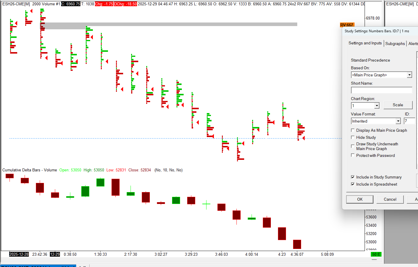 Hello Sierra Chart Support, I am experiencing a visibility issue when trying to move the Numbers Bars study to a separate subgraph region. The Issue: I have the "Numbers Bars" study applied to my chart. I went into the Study Settings > Subgraphs tab and changed the Graph Region for the Numbers Bars from 1 to 3. After applying this change, both the main price candles (Region 1) and the Numbers Bars (Region 3) disappeared. The main chart became blank, and the new bottom region appears empty. My Goal: I am trying to display the Numbers Bars in a separate panel below the main price candles. Specifically, I want to achieve a "Detrended" or "Matrix" view where the Numbers Bars are aligned horizontally (bottom-aligned) in the separate region, rather than following the price ladder/trend. My Questions: How can I restore the visibility of both the Main Chart (Candles) and the Numbers Bars in Region 3? Is this a Scaling issue? Does the Numbers Bars study natively support a "Detrended" mode where the numbers bars are displayed side-by-side (flat) in a separate region, strictly for reading the internal bid/ask/volume data without the vertical price displacement? Thank you for your assistance. |