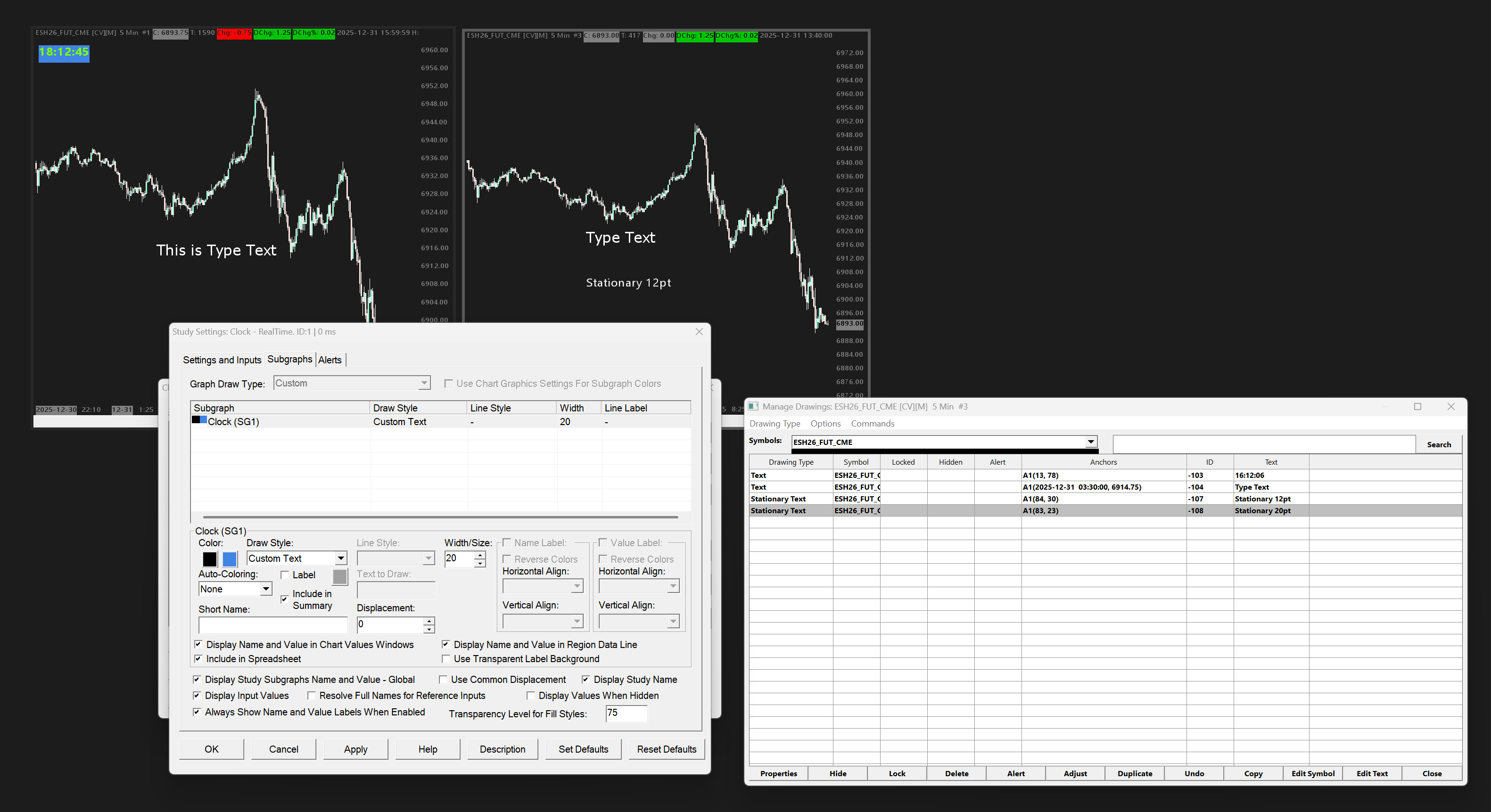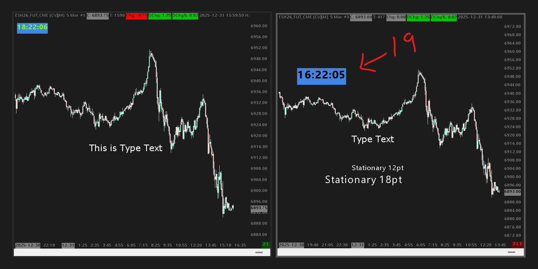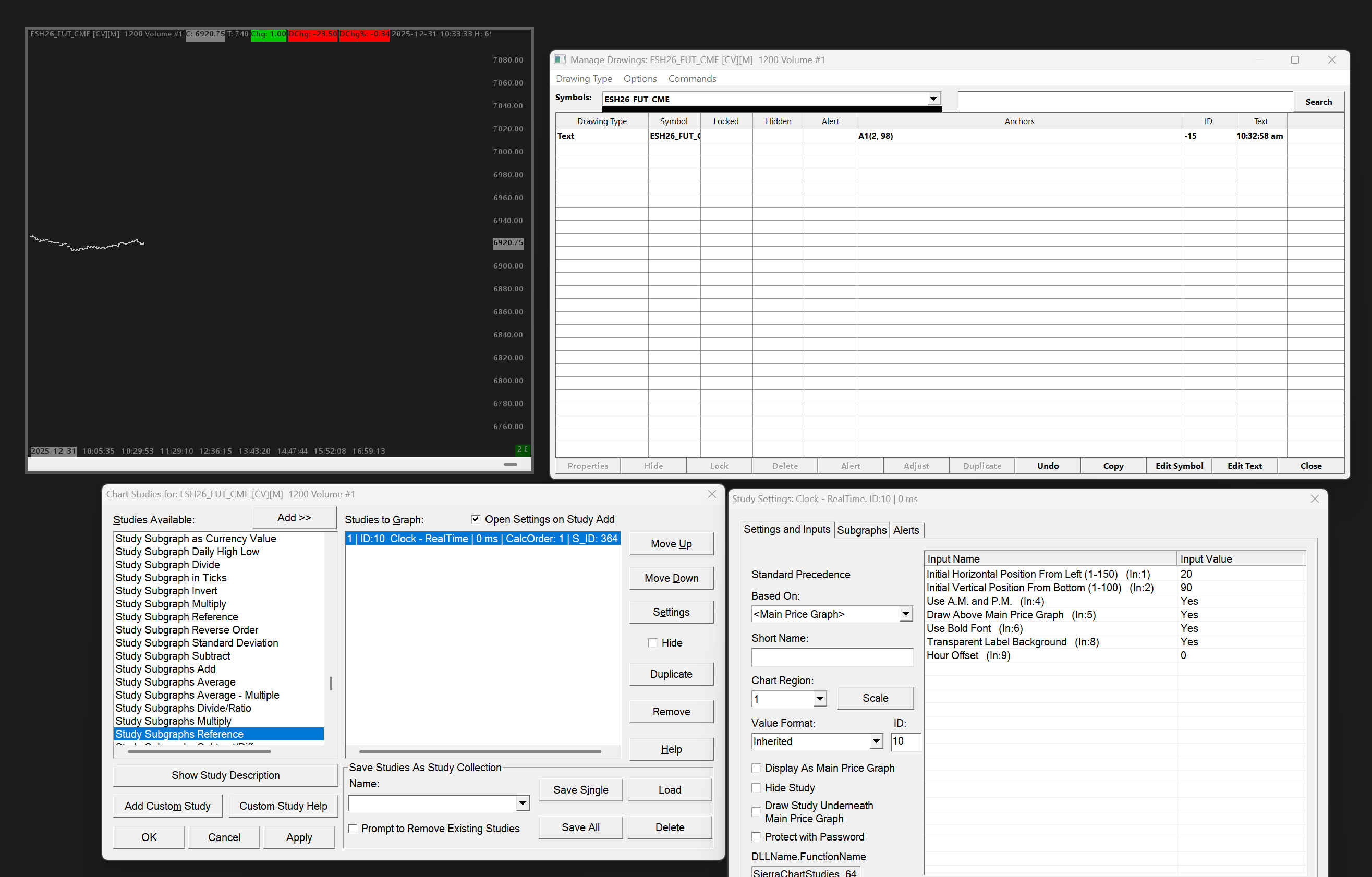 More context...adding a new clock does not work, Type Text from Tools does work, and Stationary Text does not work. Issue inside AddAndManageSingleTextDrawingForStudy??? My custom study that uses Sierra graphics DrawTextAt works. Unsure if this helps the investigation or not. 2025-12-31 10:42:38.104 | Software version: 2847 64-bit 2025-12-31 10:42:38.104 | OpenGL enabled (NVIDIA Corporation/NVIDIA GeForce RTX 5070 Ti/PCIe/SSE2) |