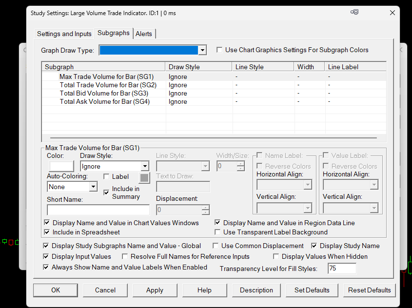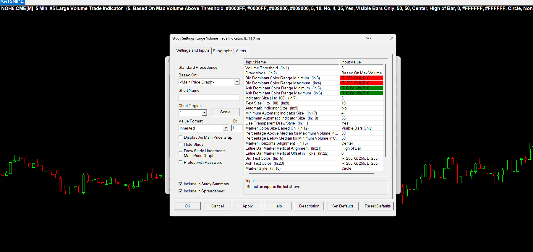 It only displays the candle sticks but none of the Large Volume Trade Indicator study. It is my first attempt to add this study to my chart book. Recently, I upgraded SC to the latest version. The attached uploaded files show the chart, the study's Settings and Inputs & Subgraphs that I am using based on a friend's chart who has had his working for a while. It is on a Renko 10-4-3 Chart with the symbol MNQH6.CME. I am using Denali data. I looked through the Message Board under the topic of Large Volume Trade Indicator not displaying where I did find a couple of older threads about a similar issue but the recommended solutions did not work. Please assist.