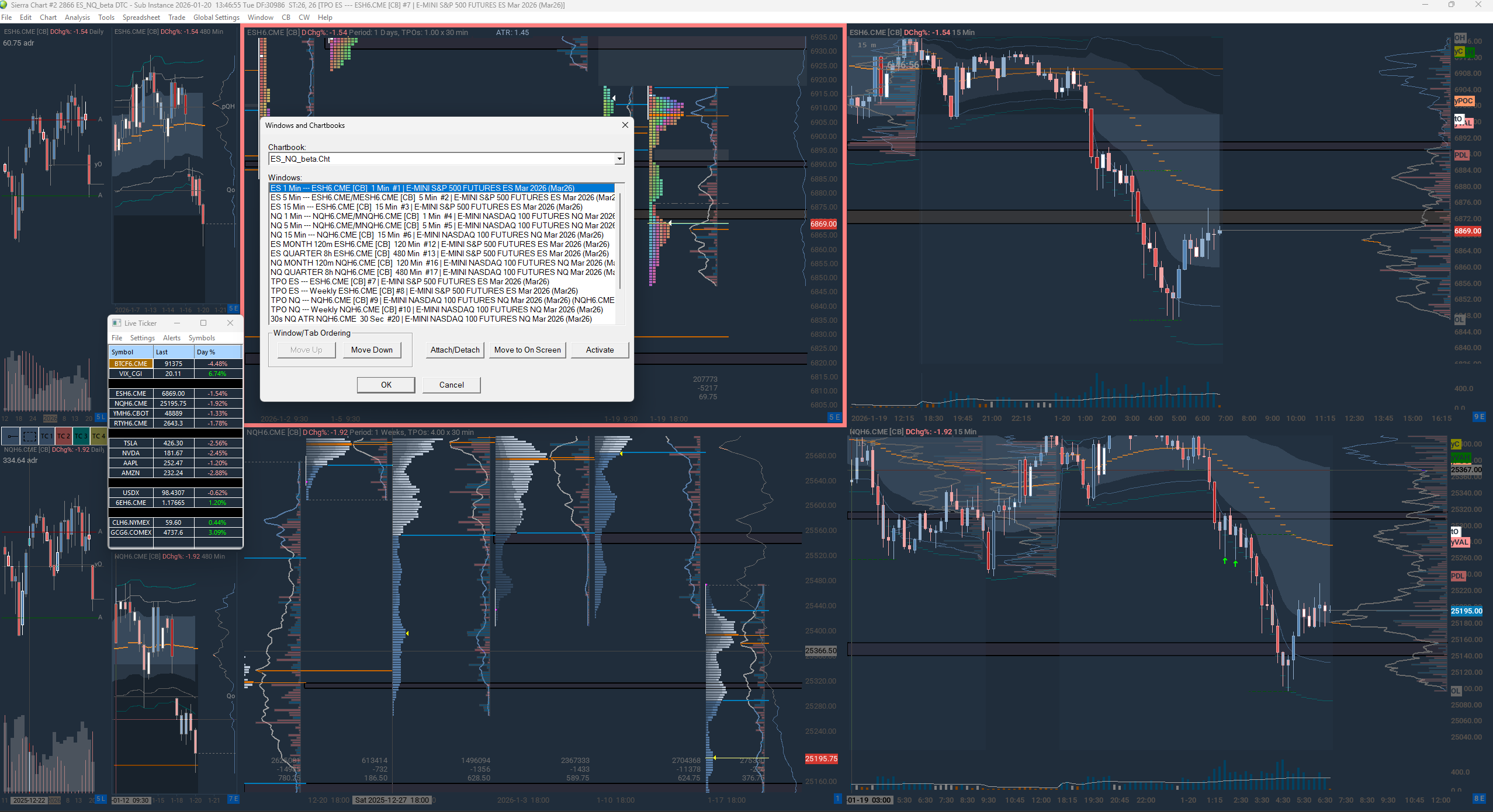 I think there is definitely a bug here, no matter how hard I try. Re your latest update of charts. No matter the position I arrange the charts in, they are always defaulting to another position. Please look at the screenshot. Let's take for example 3 charts: ES 15 min, 5 min and 1 min. It doesn't matter the order I put them in with ctrol+w (eg from top to bottom 1,5,15 or 15,5,1) after I save and relaunch every time the 15m chart is on top of the others. Every single time. I told you, due to space/monitor constraints, I need to put charts on top of each other and circle through them via keyboard shortcuts. I just want them to preserve the saved position I set via the Windows and Chartbooks list (ctrl + w). They never respect it. Please fix this Date Time Of Last Edit: 2026-01-20 11:52:33