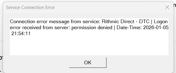 Thanks, I've followed youtube vids and your guide to set up rithmic but when I click OK I get a connection error message. A youtube video says the only way round this is to purchase Denali feed but I understand from you I don't require that? Am I doing something wrong?