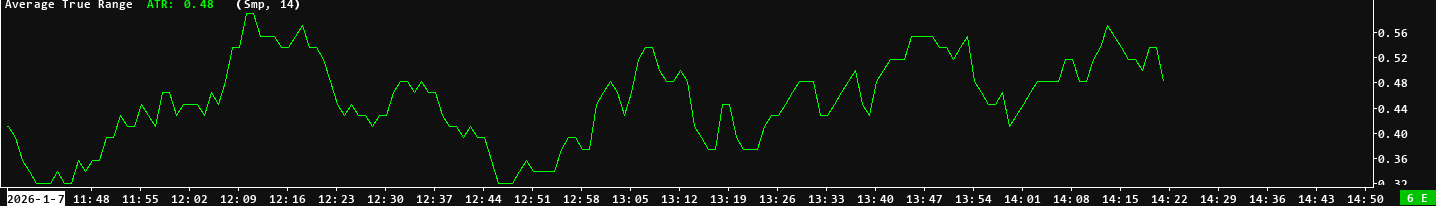 Sierra Chart is a very powerful program, but in order to take full advantage of it, you do need to learn a little bit about programming. Not low-level C++ stuff, but just the basics of how computers interpret code in order to be able to create alerts and setup items like you want. To start with, review the information at the following link for how to create alerts in general: Study/Chart Alerts And Scanning To have an alert (sound and a notice in the Chart Header) when the ATR is greater than 2.5, then you would use the following formula in the Alert tab for the ATR study itself: =SG1 > 2.5 This says that when Subgraph 1 (this contains the actual data for the ATR at each bar) is greater than 2.5, then give the alert. In order to color the ATR at those levels where the value is greater than 2.5, then you need to use the "Color Bar Based on Alert Condition" study. Refer to the following: Color Bar Based on Alert Condition In this case, since you are entering the Alert condition on a different study, you also need to specify the study in addition to the subgraph for the test, therefore the alert condition entered in the Alert tab of the Color Bar Based on Alert Condition would look like the following: =ID1.SG1 > 2.5 Where ID1 is the ID of the ATR study (you can see the ID in the Studies to Graph area of the Analysis window). You then need to setup the Color Bar Based on Alert Condition to color the line by setting these inputs and subgraph settings: - Based On: ATR study - Chart Region: Same as ATR study - Output When Condition True: Use Input Data - Input Data: ATR - Subgraphs >> Color Bar (SG1) >> Draw Style: Line Skip Zeros - Subgraphs >> Color Bar (SG1) >> Width/Size: Same as the ATR line subgraph in the ATR study For the most reliable, advanced, and zero cost futures order routing, use the Teton service: Sierra Chart Teton Futures Order Routing |