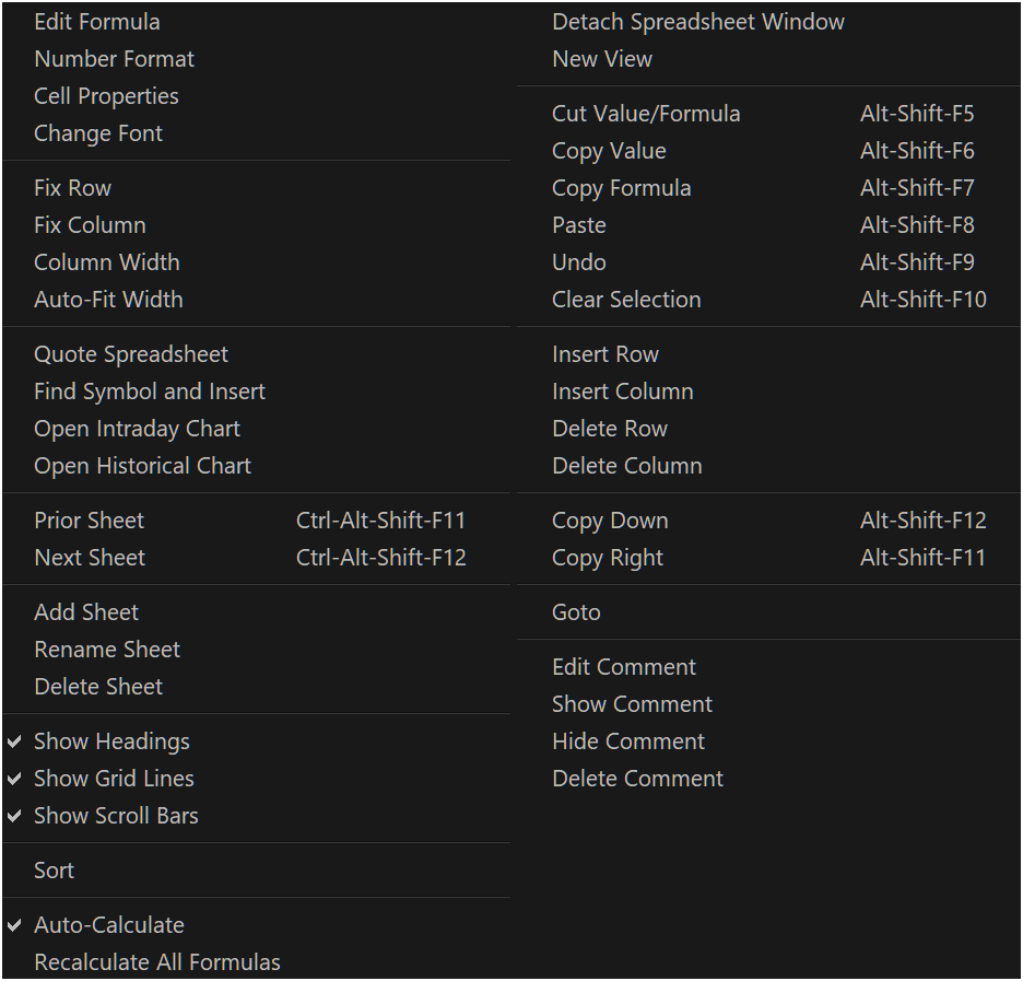 I know you've already posted about some spreadsheet and shortcut key issues in recent releases but I can't' find these specific ones mentioned anywhere. 1. Dropdown list for worksheets is not functional. If I click the list box arrow to see the list of sheets and pick one, I do see the list field highlight, but it is otherwise unresponsive. This issue existed in many previous releases but has been intermittent and I figured it might be due to something on my end. I'm just mentioning it in case you have other users reporting the same problem. 2. I used to be able to edit the value in a spreadsheet cell by hitting Enter, typing the value, and hitting Enter again. Now, I can hit Enter and change the value but the only way to execute the change is to physically click the new "OK" button with my mouse. I hope this is some sort of intermediate stage of development. Please provide a way to quickly edit spreadsheet cells - ideally the old way, but even just being able to Tab over to the OK button and hit Enter would be fine as well. It is INCREDIBLY inefficient to have to move hands off the keyboard and use the mouse for something so simple. Editing or setting up spreadsheets will take a ton more time if the current implementation stays in place. 3. The attached image shows the keyboard shortcuts I have assigned to various spreadsheet operations. I have confirmed those shortcuts are still assigned properly; however, nothing happens when I use them. I also have CTRL+ALT+SHIFT+F7 assigned to File>>Close Chartbook. That shortcut has always worked form within a spreadsheet window as well as anywhere else in the current chartbook. It no longer responds when I am in the spreadsheet. It works as expected if I click on a chart in the chartbook and then use the shortcut to close the chartbook. |