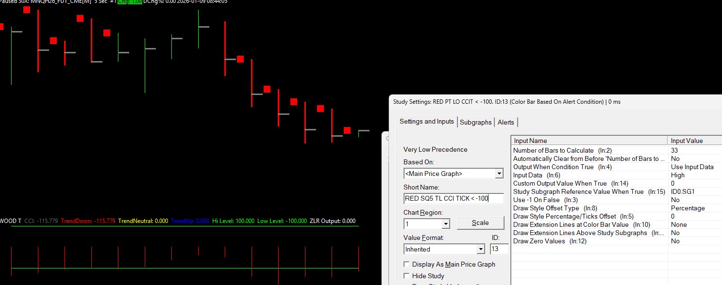 Hello, rather than create 20+ color bar based on alert condition studies, i'm trying to write a dll that selects the inputs, and measures their values, then outputs a square in a corner TL TR BL BR with a variable size and color. The code is able to output variable size points on HL but i want 4 squares 1 in each corner. The script can output squares px1 but not variable sizes. Is this even possible? if (sc.SetDefaults) { sc.GraphName = "NQ HUD: 4-Corner Woodies V4"; sc.AutoLoop = 1; sc.GraphRegion = 0; InTL.Name = "TL: Woodies Study"; InTL.SetStudySubgraphValues(5, 1); InTR.Name = "TR: Woodies Study"; InTR.SetStudySubgraphValues(7, 1); InBL.Name = "BL: Woodies Study"; InBL.SetStudySubgraphValues(9, 1); InBR.Name = "BR: Woodies Study"; InBR.SetStudySubgraphValues(11, 1); sc.Subgraph[0].Name = "TL: Splat"; sc.Subgraph[0].DrawStyle = DRAWSTYLE_SQUARE_OFFSET_LEFT_FOR_CANDLESTICK; sc.Subgraph[1].Name = "TR: Splat"; sc.Subgraph[1].DrawStyle = DRAWSTYLE_SQUARE_OFFSET_RIGHT_FOR_CANDLESTICK; sc.Subgraph[2].Name = "BL: Splat"; sc.Subgraph[2].DrawStyle = DRAWSTYLE_SQUARE_OFFSET_LEFT_FOR_CANDLESTICK; sc.Subgraph[3].Name = "BR: Splat"; sc.Subgraph[3].DrawStyle = DRAWSTYLE_SQUARE_OFFSET_RIGHT_FOR_CANDLESTICK; return; } for (int i = 0; i < 4; i++) { SCFloatArray SG1_CCI, SG2_Red, SG4_Blue; sc.GetStudyArrayFromChartUsingID(sc.ChartNumber, sc.Input.GetStudyID(), sc.Input.GetSubgraphIndex(), SG1_CCI); sc.GetStudyArrayFromChartUsingID(sc.ChartNumber, sc.Input.GetStudyID(), 2, SG2_Red); sc.GetStudyArrayFromChartUsingID(sc.ChartNumber, sc.Input.GetStudyID(), 4, SG4_Blue); // Vertical Anchor: High for Top, Low for Bottom sc.Subgraph[sc.Index] = (i < 2) ? sc.High[sc.Index] : sc.Low[sc.Index]; // Color Logic based on Woodies Trend if (SG4_Blue[sc.Index] != 0) sc.Subgraph.DataColor[sc.Index] = RGB(0, 255, 0); else if (SG2_Red[sc.Index] != 0) sc.Subgraph.DataColor[sc.Index] = RGB(255, 0, 0); else sc.Subgraph.DataColor[sc.Index] = RGB(255, 255, 255); // White Neutral // MOMENTUM "SPLAT" CALCULATION float absVal = fabsf(SG1_CCI[sc.Index]); int splatSize = 1; if (absVal >= 200.0f) splatSize = 12; // Level 3 else if (absVal >= 100.0f) splatSize = 7; // Level 2 else if (absVal >= 50.0f) splatSize = 4; // Level 1 else splatSize = 2; // Neutral // For Offset DrawStyles, we use the primary array for width per bar sc.Subgraph.Arrays[0][sc.Index] = (float)splatSize; } Date Time Of Last Edit: 2026-01-10 06:00:33