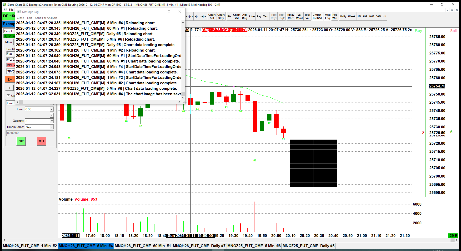 Those black boxes look like the "Compact Tool Values Window", but with the values not showing because the color is most likely set to "Black". Select "Window >> Compact Tool Values Window" to remove the checkmark next to that option and see if those black boxes go away. If they do, then this is what it is. In this case, if you want to view the text in that window, then set the following to be something other than black: https://www.sierrachart.com/ChartValuesWindowDefaultTextColor For the most reliable, advanced, and zero cost futures order routing, use the Teton service: Sierra Chart Teton Futures Order Routing |
