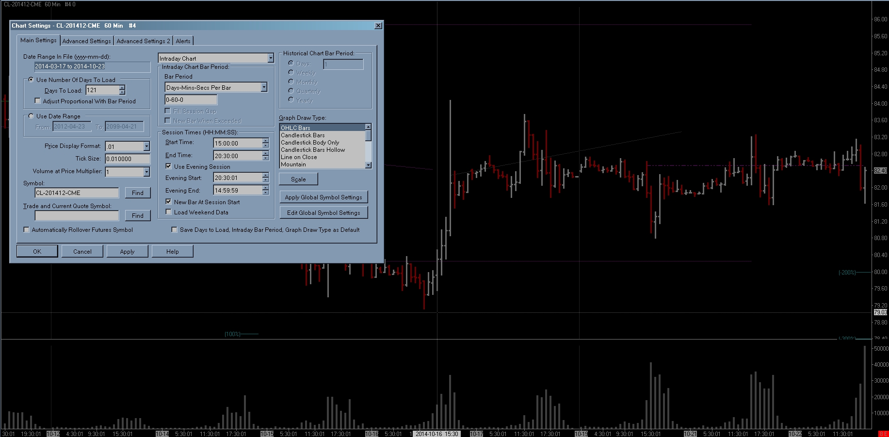 I assume this is broken since 1202. Please refer to the picture attached. For the CL (crude) Pit Session the bar should start 15:00 (CET) not 15:30 (see chart in the background with time at mouse cross-hair ) The evening/overnight session should start 20:30 (cet) If I recall correctly, this worked before in sierra. Date Time Of Last Edit: 2014-10-21 11:24:41