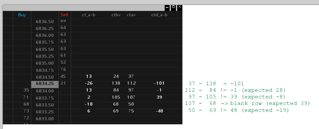 Maybe I am not understanding the diagonal calculations correctly either. See the attached file which has Cumulative Trade (CT) ask-bid, bid, ask, and diagnonal ask-bid columns (with labels). I added notes for what I thought would happen. A lot of numbers are off which makes me wonder if I do not understand the calculations Sierra is doing, or if there are errors. |
