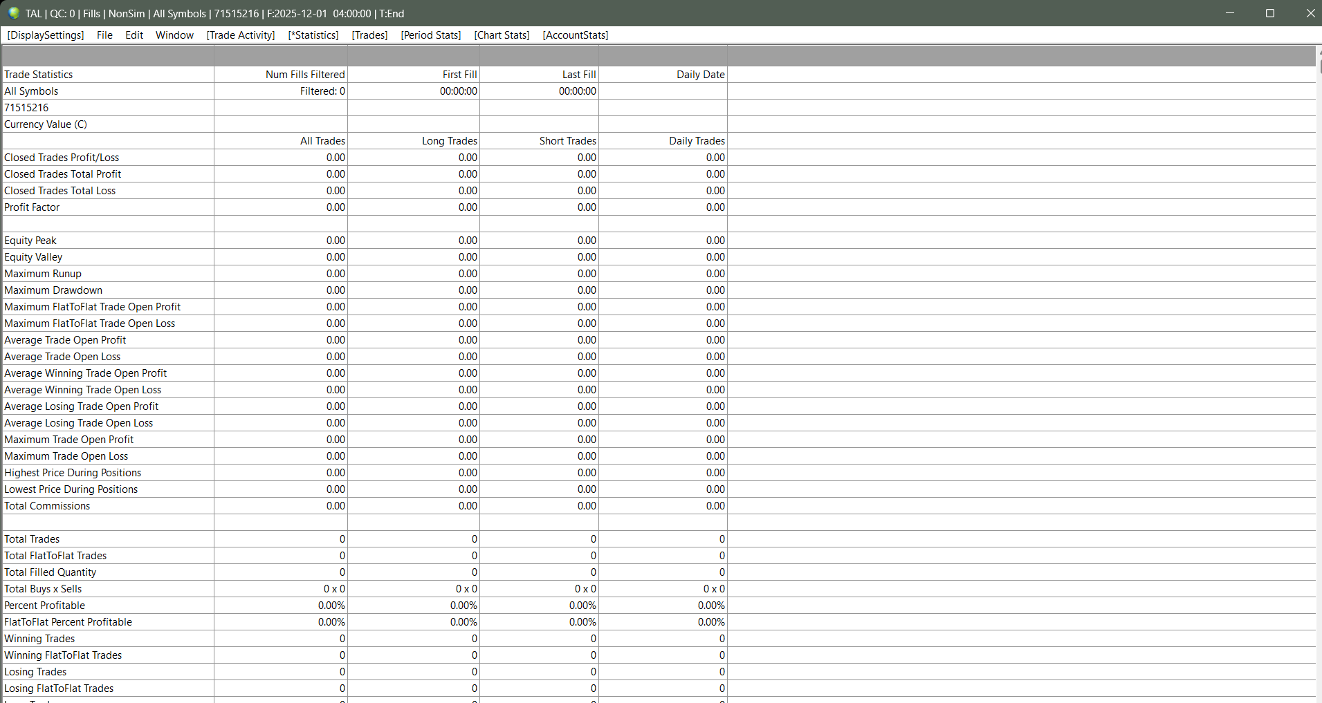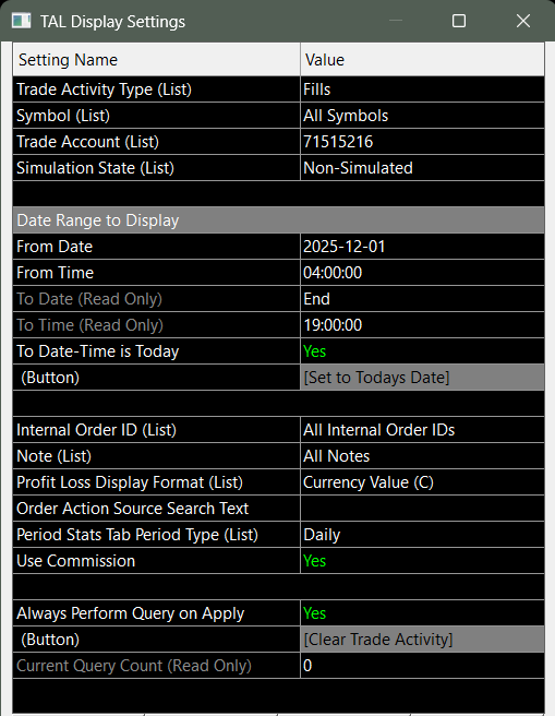 I can't figure out what settings I need to change to se my trade stats and history. I have all zeros on the tabs in the Trade Activity Log. I have my account thru Discount Trading and Ironbeam. |