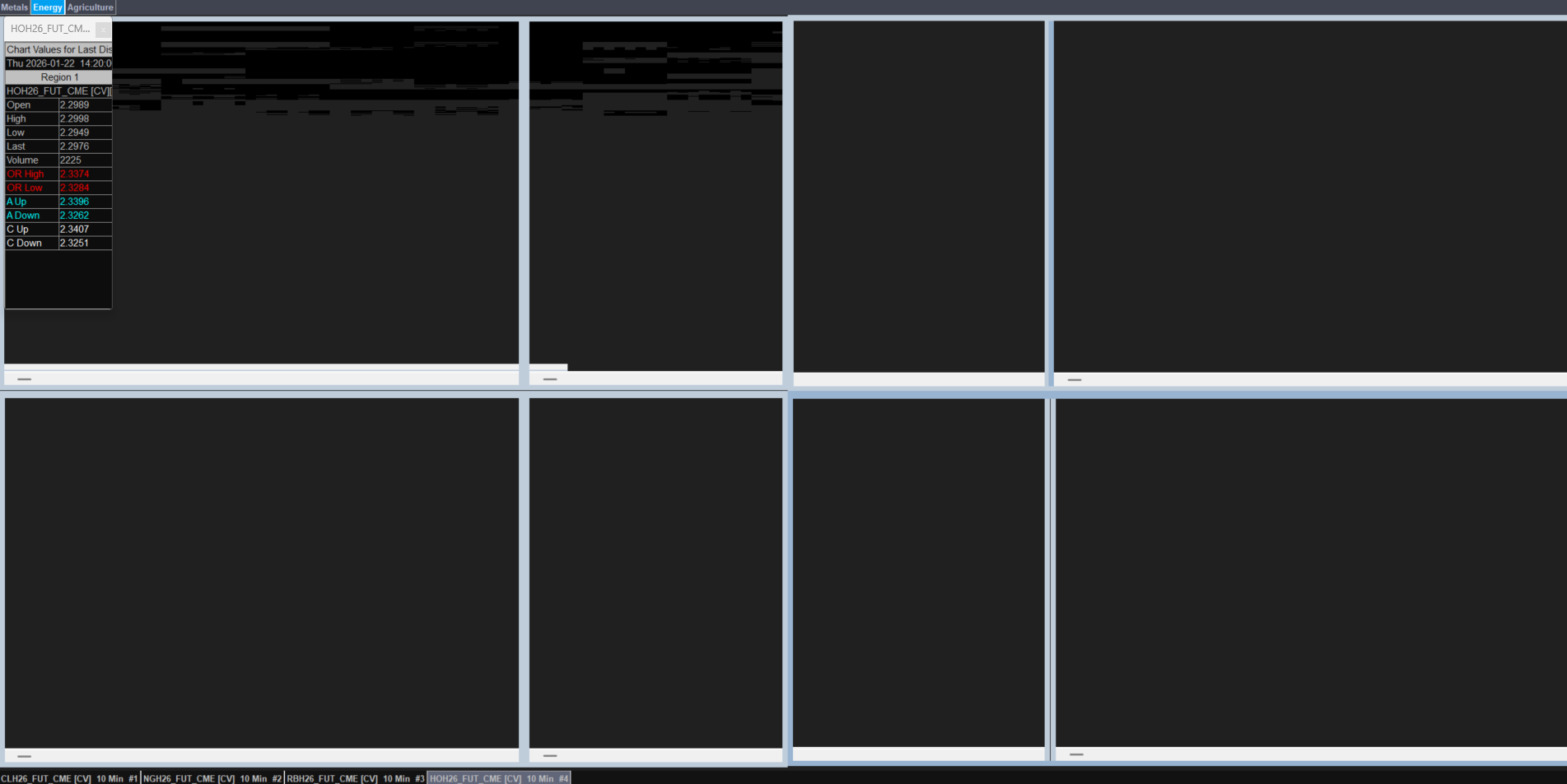 Not changing services, this just started happening out of nowhere. Quote board still works, my chart values window will show data when I click on a chart however the chart is just completely black. Ill paste my message log below 2026-01-22 17:57:34.256 | Software version: 2867 64-bit 2026-01-22 17:57:34.259 | OpenGL enabled (Intel/Intel(R) Graphics) 2026-01-22 17:57:34.259 | Primary Thread ID: 452 2026-01-22 17:57:34.259 | Usage end date: 2026-03-07 2026-01-22 17:57:34.259 | Enabled for: Advanced Features 2. 2026-01-22 17:57:34.259 | Enabled for: Sierra Chart Historical Data Service. 2026-01-22 17:57:34.259 | Enabled for: Denali Real-Time Exchange Data Feed. 2026-01-22 17:57:34.259 | Enabled for: Delayed Denali Exchange Data Feed. 2026-01-22 17:57:34.259 | Enabled for exchange2: CME (Trading Account Required) 2026-01-22 17:57:34.259 | Enabled for exchange2: CBOT (Trading Account Required) 2026-01-22 17:57:34.259 | Enabled for exchange2: COMEX (Trading Account Required) 2026-01-22 17:57:34.259 | Enabled for exchange2: NYMEX (Trading Account Required) 2026-01-22 17:57:34.259 | Allow Support for Sierra Chart Data Feeds is enabled. 2026-01-22 17:57:34.259 | Current selected Data/Trading service: Teton CME Routing 2026-01-22 17:57:34.259 | Custom symbol settings values: enabled 2026-01-22 17:57:34.259 | Chart Update Interval: 1000 2026-01-22 17:57:34.259 | Intraday Data Storage Time Unit: 0 2026-01-22 17:57:34.259 | Time Zone: -05:00:00 (EST-05EDT+01,M3.2.0/02:00,M11.1.0/02:00) 2026-01-22 17:57:34.259 | 2026-01-22 22:57:34 Local computer time in UTC 2026-01-22 17:57:34.259 | 2026-01-22 17:57:34 Local computer time in SC Time Zone 2026-01-22 17:57:34.259 | Program path: C:\SierraChart\ 2026-01-22 17:57:34.259 | Data Files path: C:\SierraChart\Data\ 2026-01-22 17:57:34.259 | OS Version Number: 10.0 2026-01-22 17:57:34.259 | Locale Setting: C 2026-01-22 17:57:34.259 | Crash reporter started: true 2026-01-22 17:57:34.259 | 2026-01-22 17:58:03.779 | CLH26_FUT_CME [CV] 10 Min #1 | Reloading chart. 2026-01-22 17:58:03.889 | NGH26_FUT_CME [CV] 10 Min #2 | Reloading chart. 2026-01-22 17:58:04.013 | RBH26_FUT_CME [CV] 10 Min #3 | Reloading chart. 2026-01-22 17:58:04.080 | HOH26_FUT_CME [CV] 10 Min #4 | Reloading chart. 2026-01-22 17:58:04.187 | RBH26_FUT_CME [CV] 10 Min #3 | Chart data loading complete. 2026-01-22 17:58:04.192 | CLH26_FUT_CME [CV] 10 Min #1 | Chart data loading complete. 2026-01-22 17:58:04.199 | HOH26_FUT_CME [CV] 10 Min #4 | Chart data loading complete. 2026-01-22 17:58:04.269 | NGH26_FUT_CME [CV] 10 Min #2 | Chart data loading complete. 2026-01-22 17:58:10.231 | ZSH26_FUT_CME [CB] 5 Min #7 | Reloading chart. 2026-01-22 17:58:10.232 | Added historical Intraday data request for ZSH26_FUT_CME to the queue. 2026-01-22 17:58:10.232 | Triggering next historical data download in queue. 2026-01-22 17:58:10.241 | ZSH26_FUT_CME [CB] 5 Min #7 | Waiting for historical downloads to complete with the IDs: 13, 2026-01-22 17:58:10.255 | ZLH26_FUT_CME [C] 5 Min #11 | Reloading chart. 2026-01-22 17:58:10.257 | Added historical Intraday data request for ZLH26_FUT_CME to the queue. 2026-01-22 17:58:10.257 | ZLH26_FUT_CME [C] 5 Min #11 | Waiting for historical downloads to complete with the IDs: 14, 2026-01-22 17:58:10.268 | ZWH26_FUT_CME [CB] 5 Min #12 | Reloading chart. 2026-01-22 17:58:10.270 | Added historical Intraday data request for ZWH26_FUT_CME to the queue. 2026-01-22 17:58:10.282 | ZWH26_FUT_CME [CB] 5 Min #12 | Waiting for historical downloads to complete with the IDs: 15, 2026-01-22 17:58:10.299 | ZCH26_FUT_CME [CB] 5 Min #13 | Reloading chart. 2026-01-22 17:58:10.300 | Added historical Intraday data request for ZCH26_FUT_CME to the queue. 2026-01-22 17:58:10.320 | ZCH26_FUT_CME [CB] 5 Min #13 | Waiting for historical downloads to complete with the IDs: 16, 2026-01-22 17:58:10.331 | KEH26_FUT_CME [C] 5 Min #3 | Reloading chart. 2026-01-22 17:58:10.332 | Added historical Intraday data request for KEH26_FUT_CME to the queue. 2026-01-22 17:58:10.332 | KEH26_FUT_CME [C] 5 Min #3 | Waiting for historical downloads to complete with the IDs: 17, 2026-01-22 17:58:10.345 | ZMH26_FUT_CME [C] 5 Min #1 | Reloading chart. 2026-01-22 17:58:10.347 | Added historical Intraday data request for ZMH26_FUT_CME to the queue. 2026-01-22 17:58:10.347 | ZMH26_FUT_CME [C] 5 Min #1 | Waiting for historical downloads to complete with the IDs: 18, 2026-01-22 17:58:10.374 | Mapping ZSH26_FUT_CME to ZSH26. Service code: cbot 2026-01-22 17:58:10.374 | Denali Data Feed | Starting real-time market data updates for: ZSH26_FUT_CME (ZSH26). ID: 29 Service code: cbot 2026-01-22 17:58:10.374 | Denali Data Feed | Requesting security definition data for: ZSH26_FUT_CME (ZSH26). ID: 29 2026-01-22 17:58:10.375 | Mapping ZLH26_FUT_CME to ZLH26. Service code: cbot 2026-01-22 17:58:10.375 | Denali Data Feed | Starting real-time market data updates for: ZLH26_FUT_CME (ZLH26). ID: 30 Service code: cbot 2026-01-22 17:58:10.375 | Denali Data Feed | Requesting security definition data for: ZLH26_FUT_CME (ZLH26). ID: 30 2026-01-22 17:58:10.375 | Mapping ZWH26_FUT_CME to ZWH26. Service code: cbot 2026-01-22 17:58:10.375 | Denali Data Feed | Starting real-time market data updates for: ZWH26_FUT_CME (ZWH26). ID: 31 Service code: cbot 2026-01-22 17:58:10.375 | Denali Data Feed | Requesting security definition data for: ZWH26_FUT_CME (ZWH26). ID: 31 2026-01-22 17:58:10.375 | Mapping ZCH26_FUT_CME to ZCH26. Service code: cbot 2026-01-22 17:58:10.375 | Denali Data Feed | Starting real-time market data updates for: ZCH26_FUT_CME (ZCH26). ID: 32 Service code: cbot 2026-01-22 17:58:10.375 | Denali Data Feed | Requesting security definition data for: ZCH26_FUT_CME (ZCH26). ID: 32 2026-01-22 17:58:10.375 | Mapping ZMH26_FUT_CME to ZMH26. Service code: cbot 2026-01-22 17:58:10.375 | Denali Data Feed | Starting real-time market data updates for: ZMH26_FUT_CME (ZMH26). ID: 33 Service code: cbot 2026-01-22 17:58:10.375 | Denali Data Feed | Requesting securi