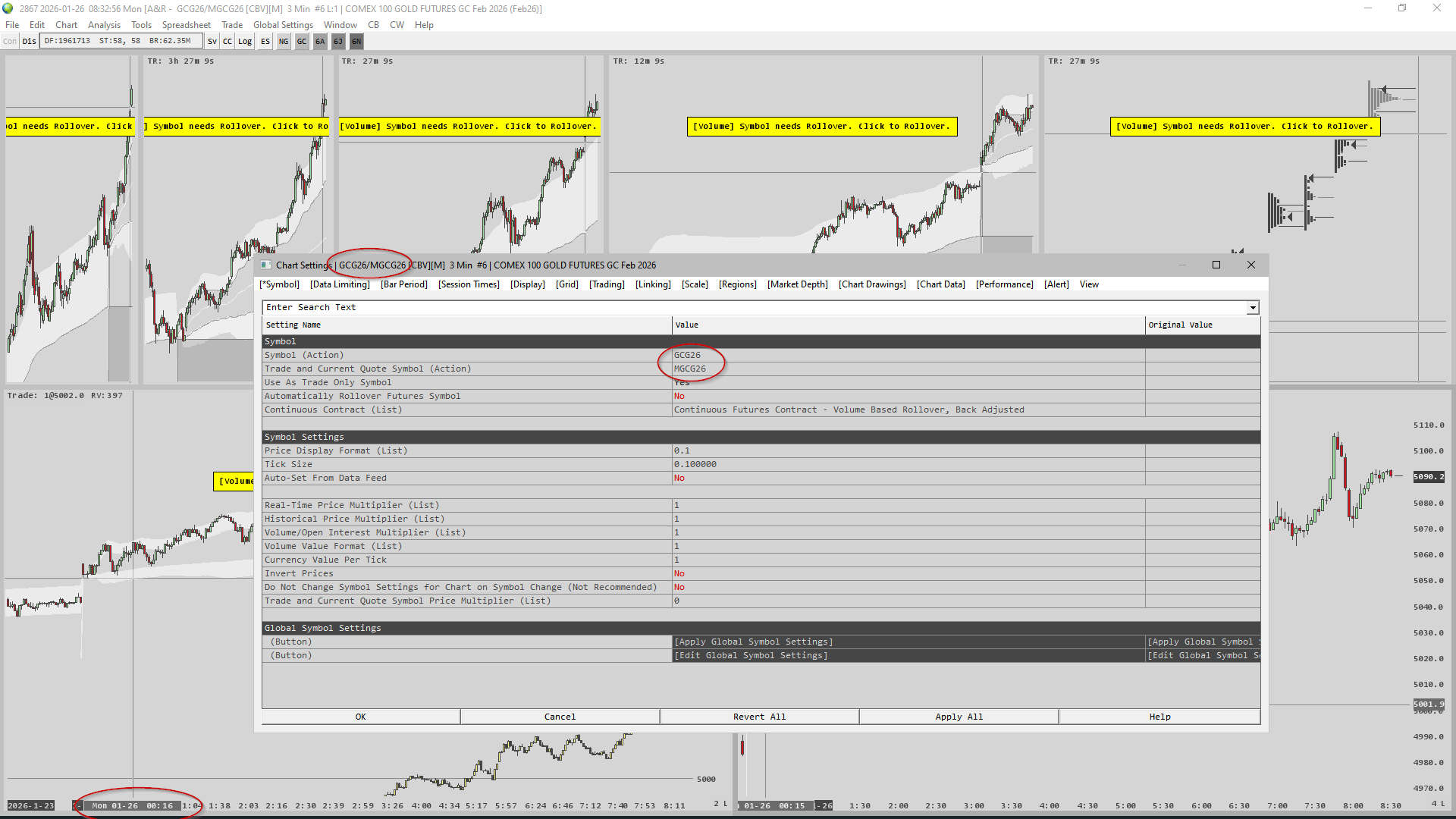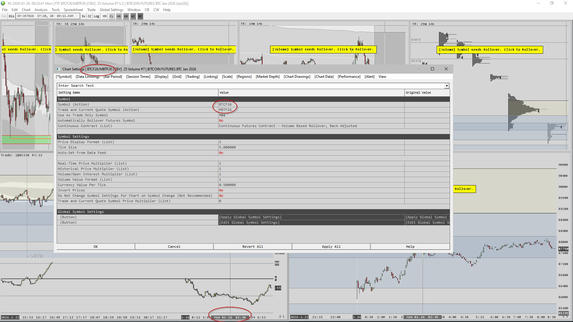 Good morning, I have been experiencing an issue since the beginning of this Month, January 2026, about the "Detect Rollover Of Current Futures Contracts Symbols Based On Real Time Volume" option whenever is enabled. The first instance happened on CL, then NG and today also in GC and BTC I am currently displaying the GCG26 and BTCF26 contracts. After verifying both on the Quote Board and directly on the CME website, I can confirm that those 2 contracts remains the front-month contracts with the highest trading volume. For additional certainty, I also checked the next contracts (GCJ26 and BTCG26), which are still showing significantly lower volume compared to their counterparts. Despite this, the platform has been prompting me to roll over to the next contracts. When I temporarily switch to the new ones, the rollover message disappears — which suggests the system incorrectly consider them to be the most active contract. Could you please assist in investigating this behaviour? The same thing happened some weeks ago in CL and NG. Now the volume is clearly shifted on those, yet the system gave me the same exact issue I am currently experiencing on GC and BTC. I thought it was an isolated case, so I didn't bother. However, now this episode is repeating again and again, so it means something is "off" with the evaluation of the volume exchanged. For reference, I am running the most recent version of Sierra Chart (v2867). Thank you in advance for your support. Best regards, Fabio |