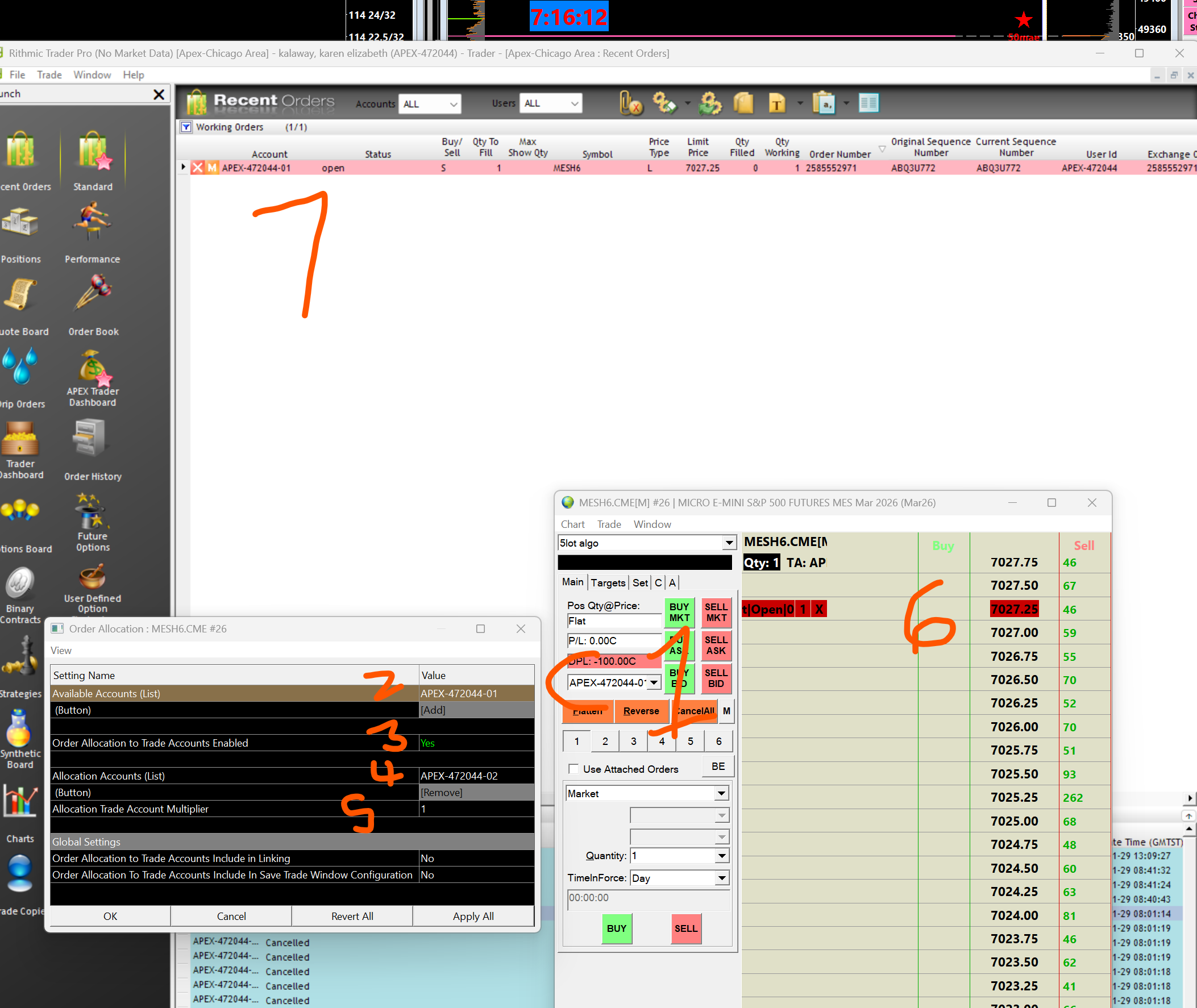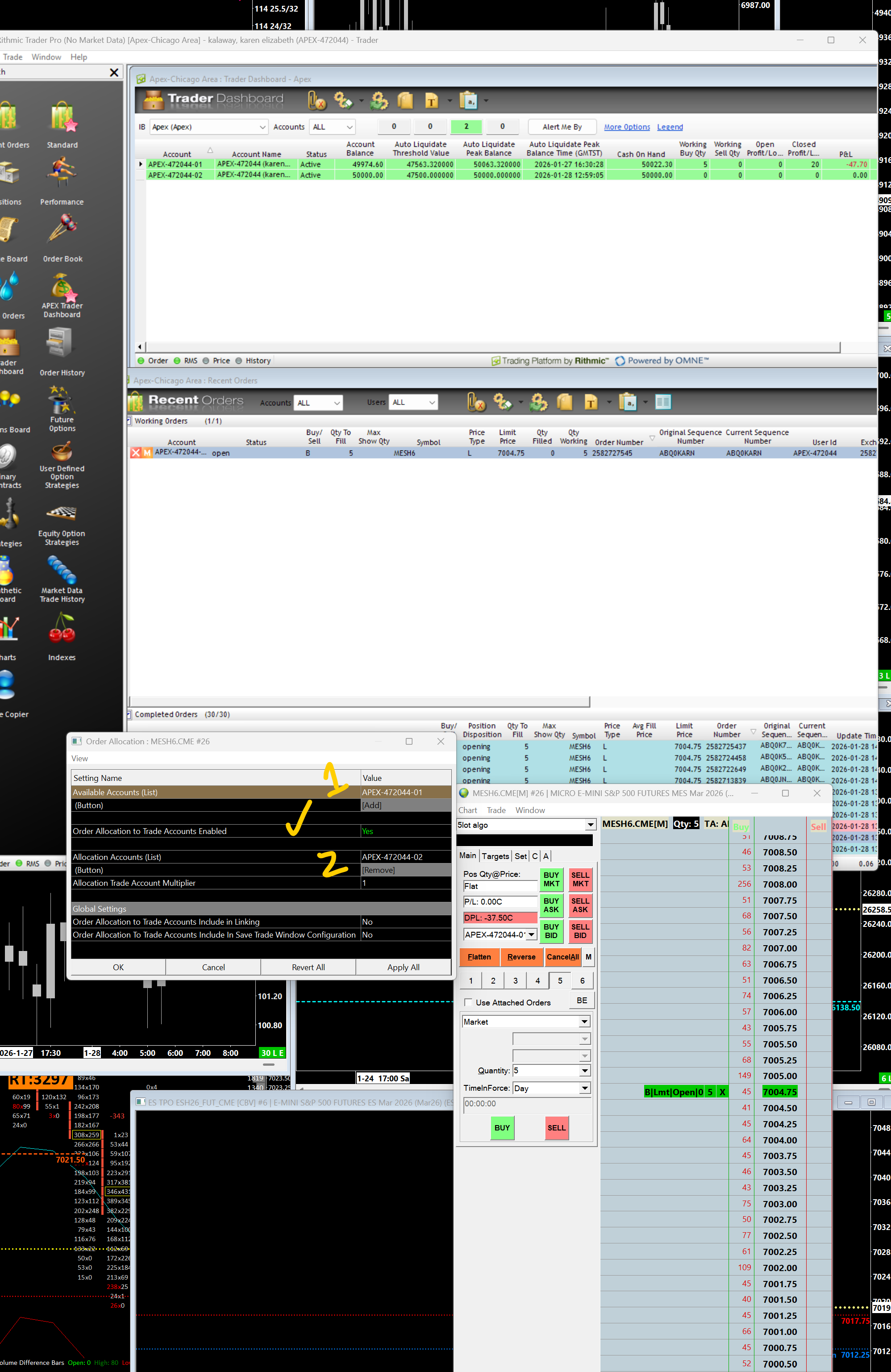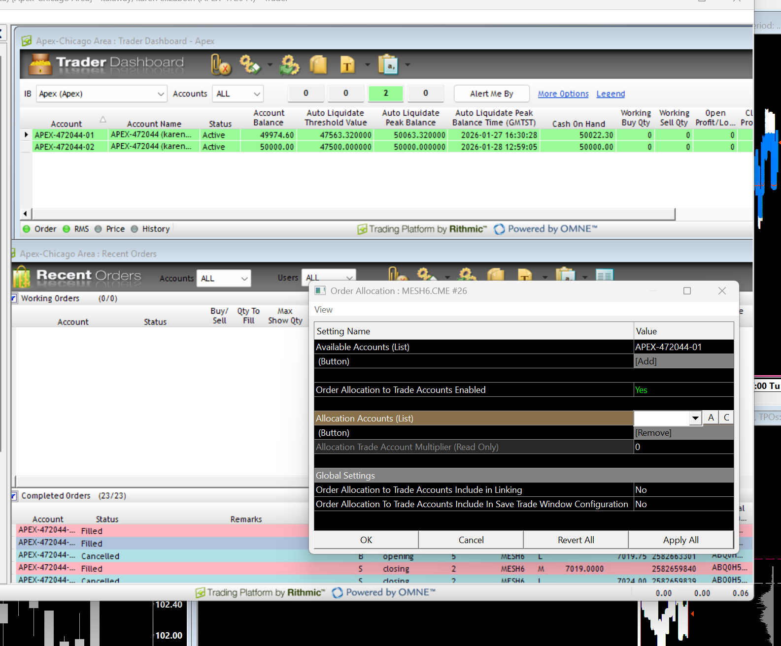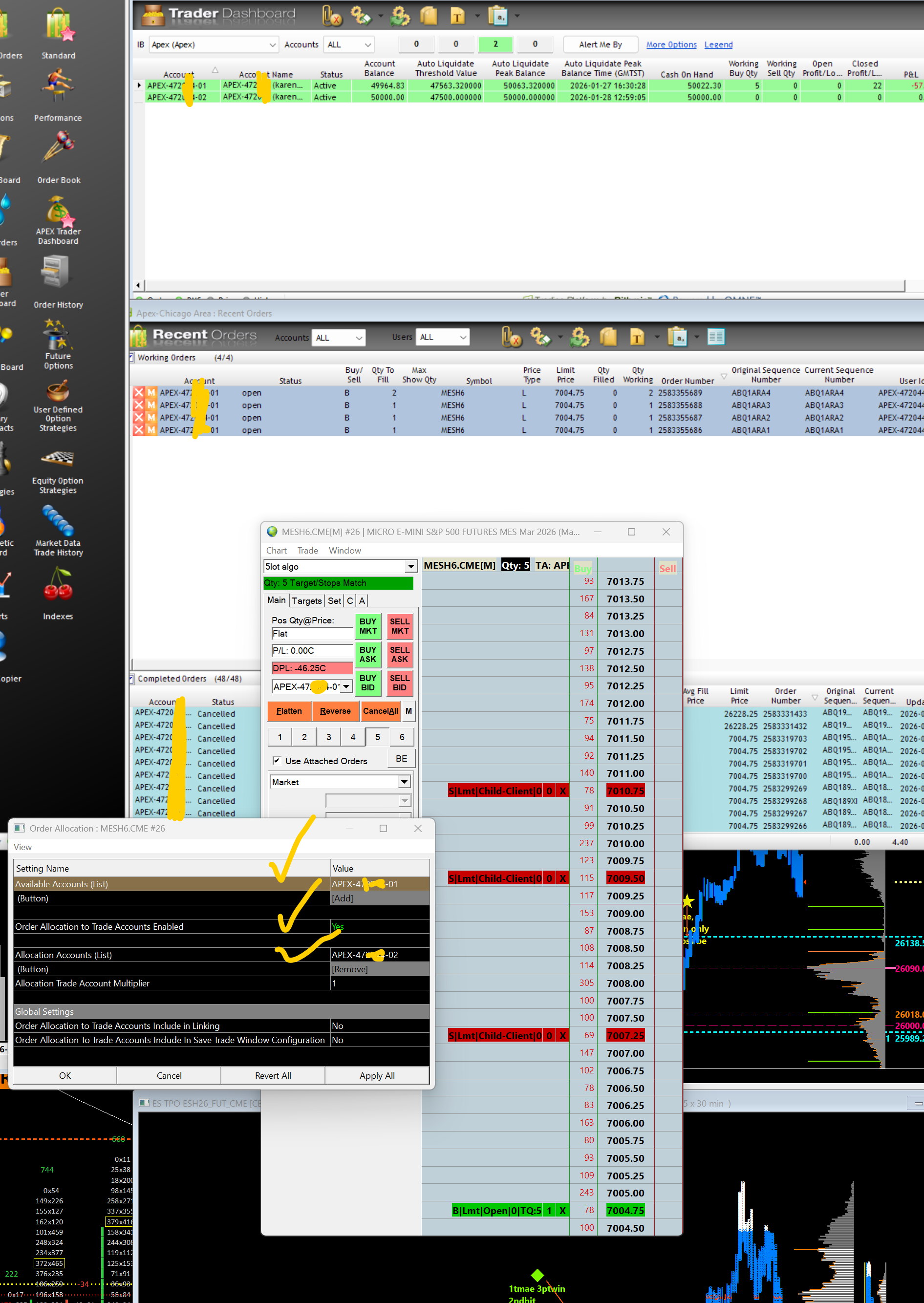 Mate, I have gone over this again and again, and I can't see what is wrong. The only 'chart/dom' open in this chartbook for MESH6 is what you see in the screenshot of #26 dom. 1- I have the 01 acct selected on main dom page, you see it circled 2- I have the 01 acct as the top line 'available accts' 3- I have the 'enabled' to YES 4- I have the 02 acct as the 'allocation' 5- I have multiplier at 1. 6- I have a 1 lot entered in the chart/dom, which correctly shows as live in Apex open orderbook 7- There is NO second allocated order being created for acct 02 I am trying so hard, but I don't see what is wrong...I hate taking up your time, but I have to get this to work. Karen |