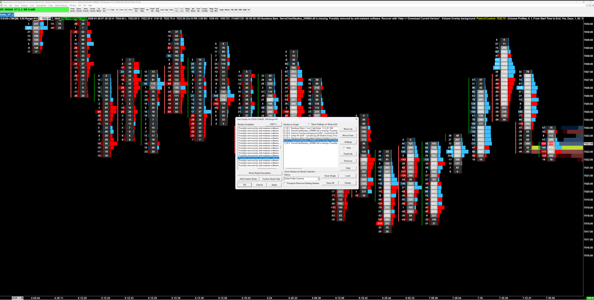 I am seeing the messages "sierrachartstudies_arm64.dll is missing. possibly removed by an anti-maleware software." when I go to Chart Studies? I just closed and re-logged into Sierra Chart and this is what happened? How do I get this error to go away? I no longer see one of my volume bar studies on my chart anymore. |