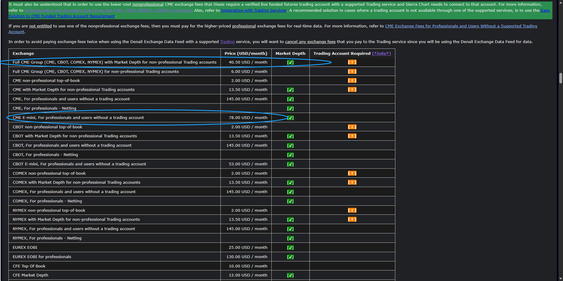 The first thing to keep in mind is that in order to get the CME Group data at the Non-Professional rates, you need a live, funded, futures trading account. And you need to connect your Sierra Chart software to that account at least once a month. Refer to the following: Denali Exchange Data Feed: Understanding and Accessing Data From the CME, CBOT, NYMEX, COMEX Exchanges If you do not want to setup a live, funded, futures trading account, then you would need to pay for the Professional exchange option. For the most reliable, advanced, and zero cost futures order routing, use the Teton service: Sierra Chart Teton Futures Order Routing |