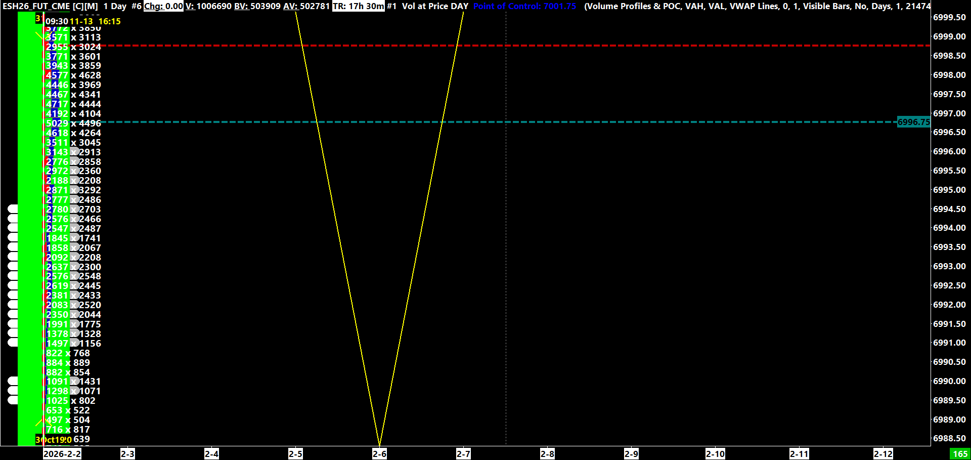 I think i misspoke on the Inputs.I switched the wording. It works, so I know its correct. Let me Clarify: For my Ask Levels >1000, the settings are Vol Threshold=1, and Additional Vol Threshold=1000 (shown as Grey Rt Bar at Level) For my Bid Levels > 1000, the settings are Vol Threshold=1000 , and Additional Vol Threshold=1 (Shown as Left Bar at Level. I realized awhile back that even though different color, if both Left Bars, if both Bid and Ask levels are >1000, I only see one arrow bc theyre stacked [unless I offset one]) So to clarify, the levels and everything are correct if I use it on a Multiple Profiles Based on Bar Count. But I want cumulative real time in RTH. To to that i would need ONE bar for the day RTH, Ive tried different settings and cant get the alert to work on ONE DAY. I currently have an interday chart with 1-0-0 I have the above alert settings. As you can see from the upload, the arrows are at over 1000 on some, but not all of them. (btw the White/Grey Arrows are "Draw Study Underneath Main Graph, but you can still see the ends) https://www.sierrachart.com/image.php?Image=1770075487185.png below if the alerts set to 150. As you can see again, no rhyme or reason. Most are above 150 Ask or Bid, yet only some have an arrow https://www.sierrachart.com/image.php?Image=1770076600677.png |