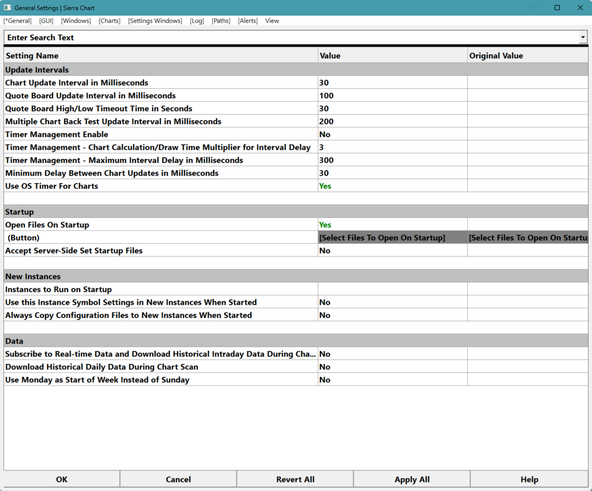 I made some changes to the Update Interval portion of the screen located at: Global Settings > General Settings > General and did not write down the defaults that were there before I made the changes. Now, when I start up SC, it takes about 4 minutes for Rithmic to populate the data and begin streaming. Before the changes I made in an attempt to make SC even faster, it would only take about 30 seconds to load and populate the data and then begin streaming. Here is what I have under the Update Interval section of Global Settings > General Settings > General Settings name Update Intervals Chart Update Interval in MS is 30 Quote Board Update Interval in MS is 100 Quote Board High/Low Timeout Time in Seconds is 30 Multiple Chart Back Test Update Interval in MS is 200 Timer Management Enable is No Timer Management - Chart Calculation/Draw Time multiplier for Interval Delay is 3 Timer Management - Maximum Interval Delay in MS is 300 Minimum Delay Between Chart Update in MS is 30 US OS Timer for Charts Yes I made no changes to anything else in this section or to anything else on this whole screen. I attached a screenshot of what I currently have to this support post. What were the default settings for the Update Interval section of the attached screenshot that SC had preset before the changes I made above so that I can put it back? I read the info at General Settings Window: Chart Update Interval (Global Settings >> General Settings >> General >> Update Intervals) Thanks. Date Time Of Last Edit: 2026-01-30 21:44:16