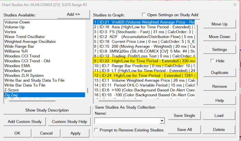 Why does the study for "High-Low for Time Period - Extended" has such a 7289 MS time for the SilH6, when the NQ, which is very fast and volatile and has more volume only has a "High-Low for Time Period - Extended" 230 MS time? The GC is even worse than the SIL. I have seen the GC have a MS time for "High-Low for Time Period - Extended" of about 15000 MS. I have attached a screenshot for the SIL and the NQ and highlighted the high MS time for "High-Low for Time Period - Extended" in yellow. I think this all started when I update to version 2868 and now that I am on 2873, it still continues. I am a One Up Trader whose only choice is to use a Rithmic feed into Sierra Charts. Date Time Of Last Edit: 2026-02-03 01:43:34