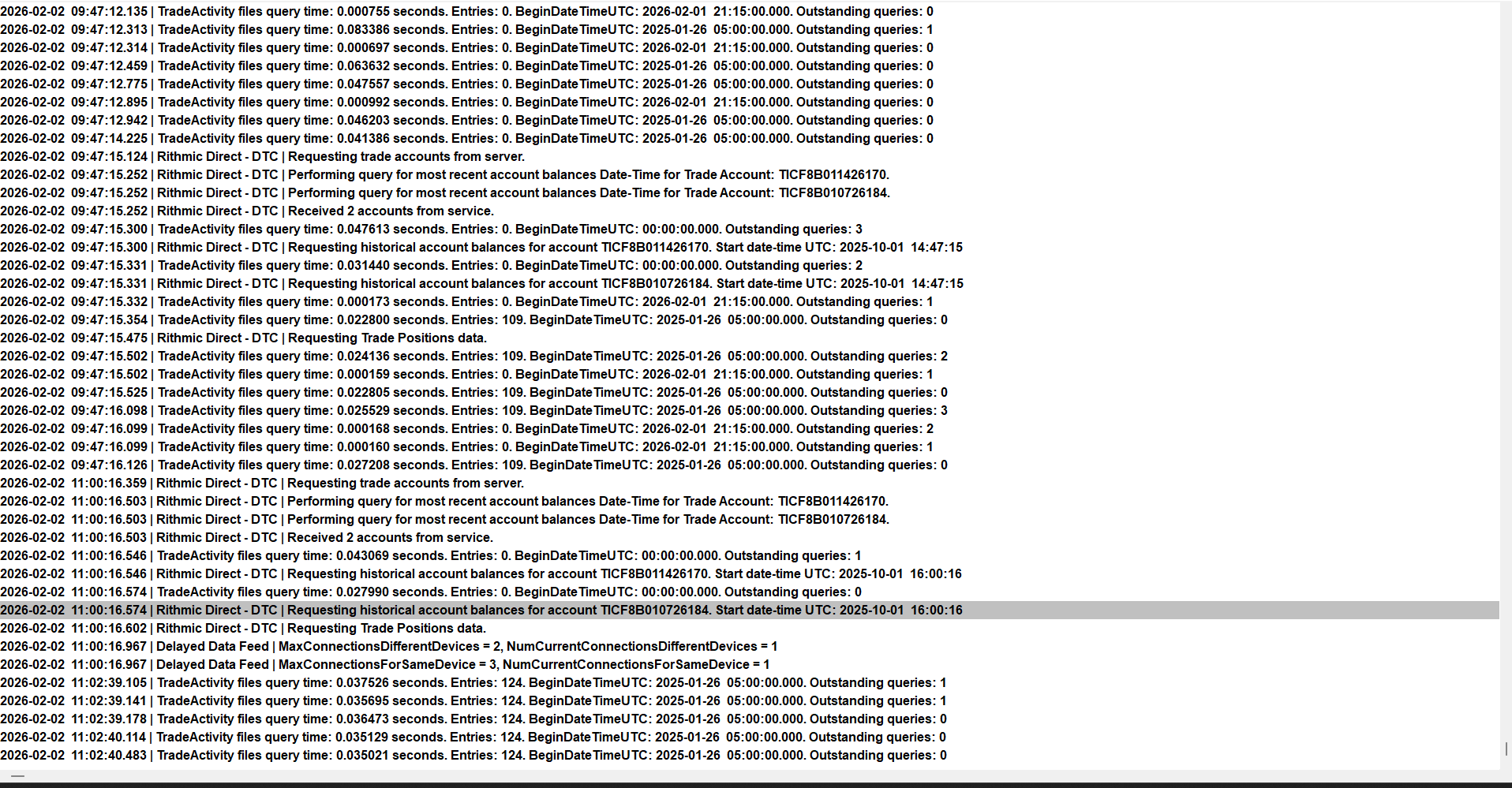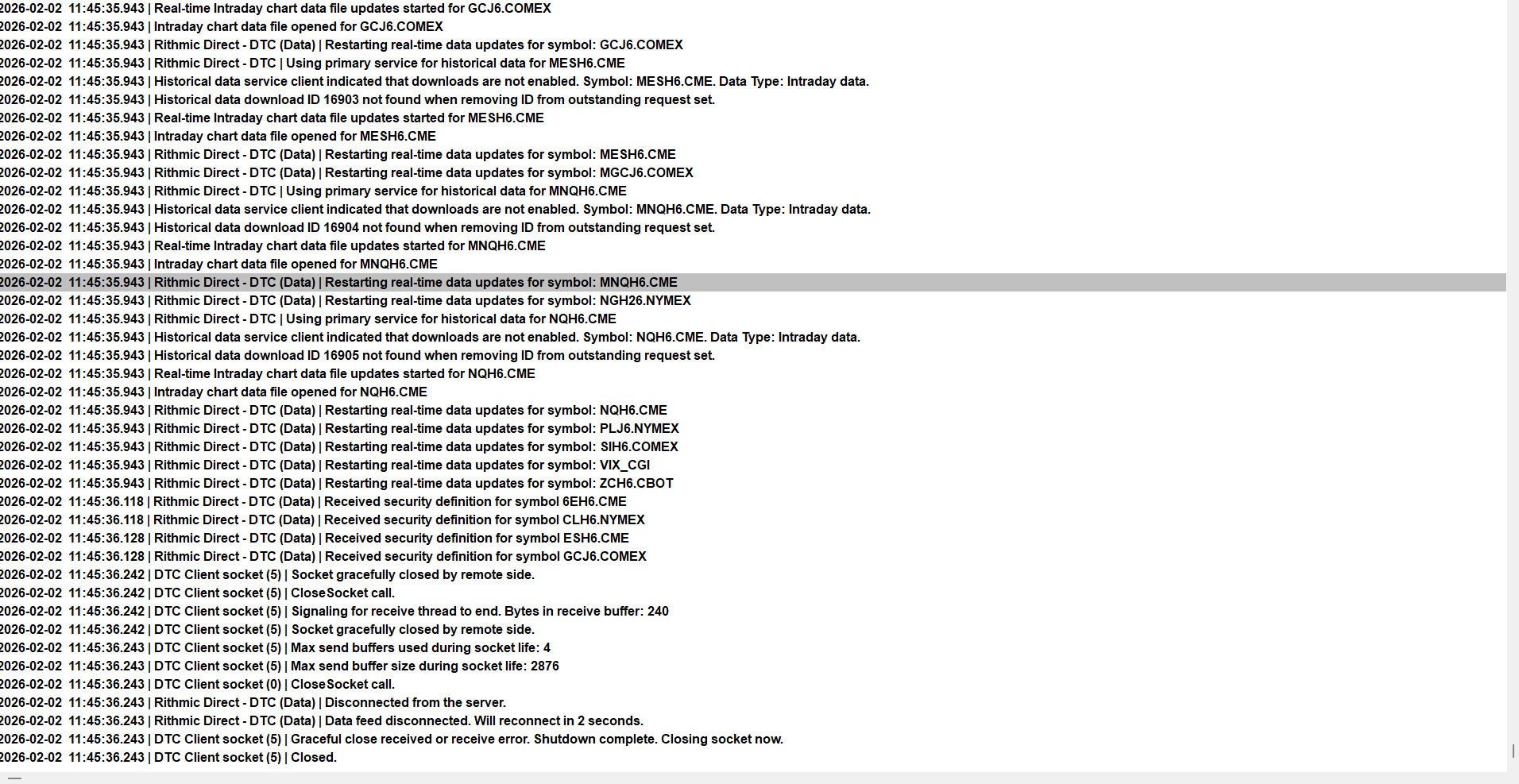 Hello, I am receiving a message Historical Intraday Data Download skipped and my data feed is not working. I am using Rithmic Direct and I receive data through my evaluation account. It worked throughout January but it stopped since yesterday. On their behalf they say all market data access is enabled. I have looked at the following post: Historical Intraday Data Download Skipped problem And when I switch to Teton CME routing everything is fine as I paid for Denali data and I have a live trading account with Teton routing (Philip Capital) and I have connected to it. I have also logged in to my Rithmic trader pro paper trading account and logged off but it is still not working. I don't have live Rithmic account. I am sending you my message logs. Can you give me advice what to do? |