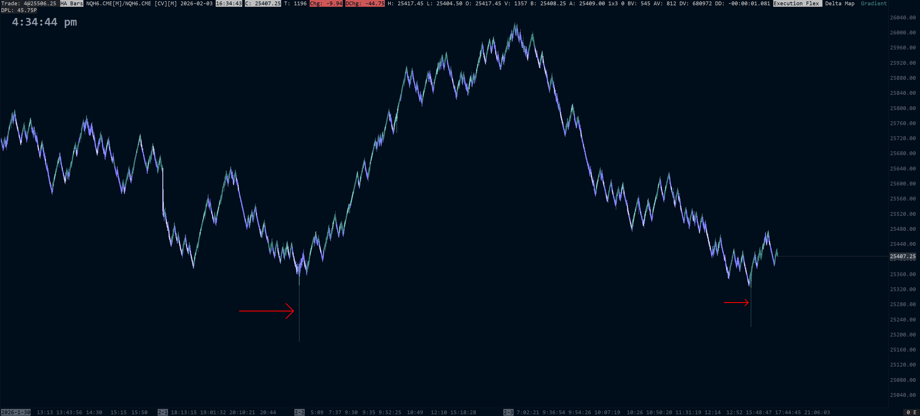 https://www.sierrachart.com/image.php?Image=1770154487680.png I am using Flex Renko candles with heikin ashi. For the last few days, a renko candle will get stuck and a new one will not form. Price just keeps going up and down the same candle for around a half hour or so before it starts the next candle. The image link shows one that happened on the 2nd and one that happened today, with red arrows pointing to them. Not having any issue with volume-based candles nor time period candles. |