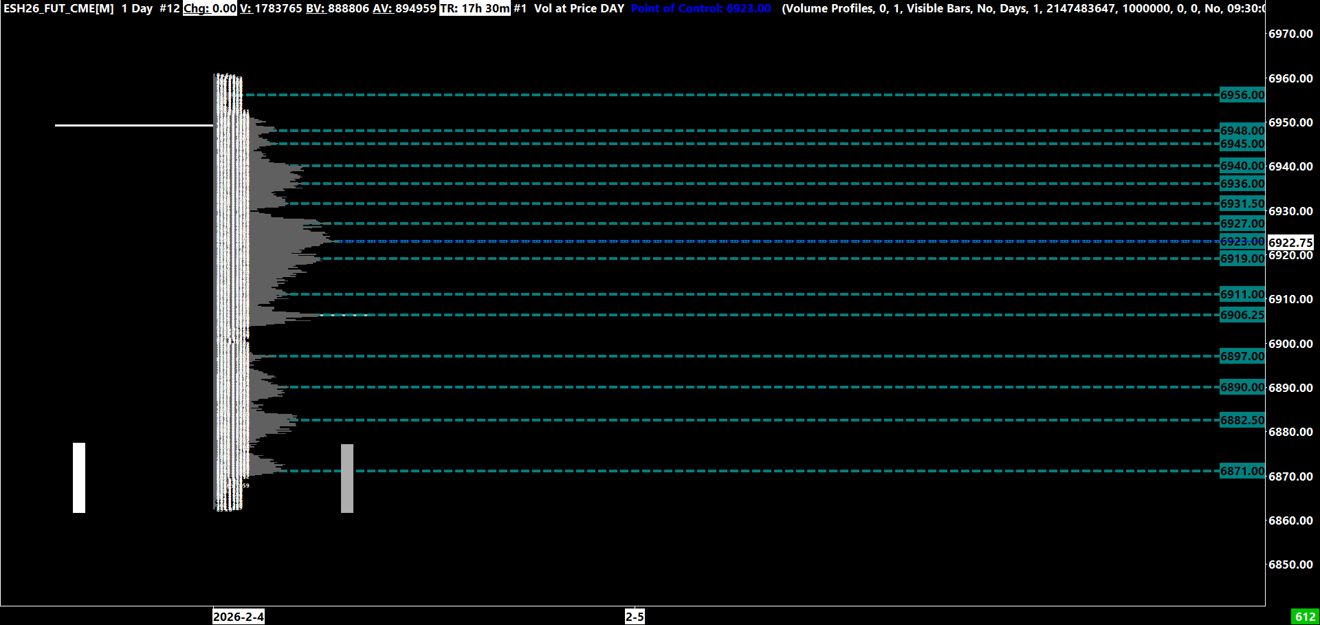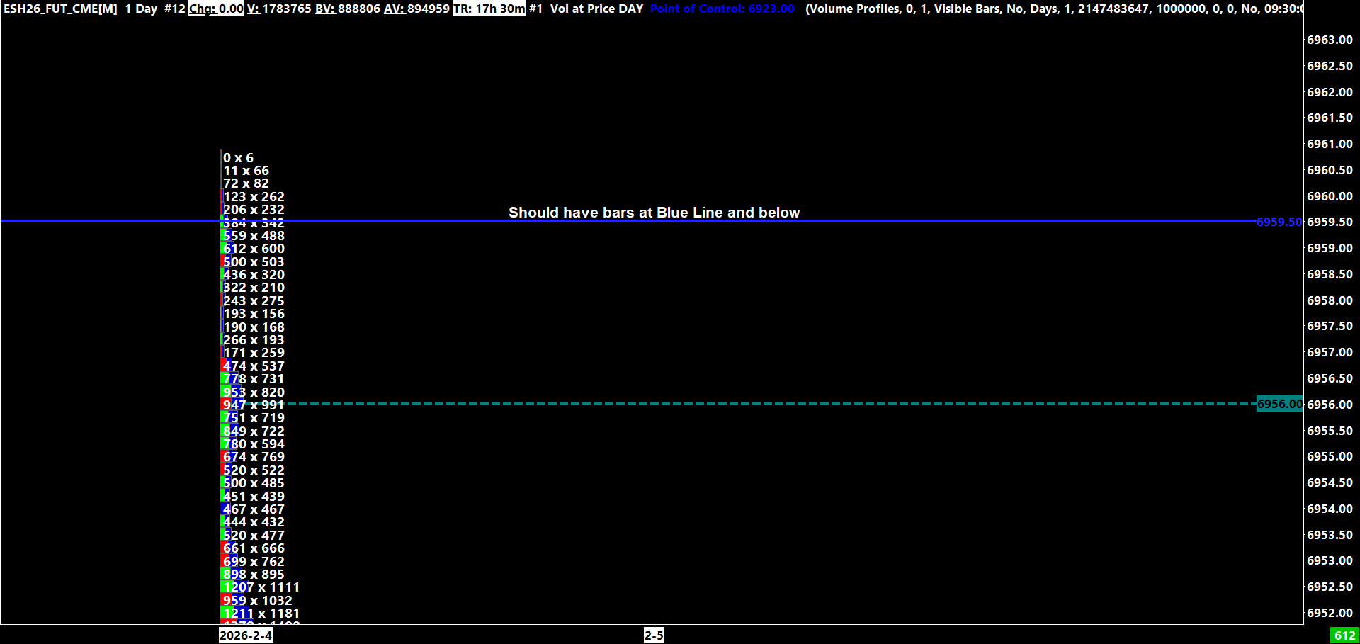 Still cant get Volume at Price Threshold Alert (V2) to work properly! These are my settings: 1) I have a Intraday Chart ONLY open 1-0-0 One day loaded Day Session only 9:30-15:59:59 2) I Vol at Price study added Vol Graph Period=Visible Ste as Independent Profile=No Time period Type for Fixed Time=Days Time period Length for Fixed Time=1 Vol Bar Calc Method=Total Volume 3 & 4) I have two Vol at Price threshold Alert v2.. The Rt side Grey BAr is ASk>250. The left side bar >250 These are the settings for the Grey Bar: Comparison Method= Ask Volume (Bid for White Bar) Volume threshold=250 Everything else default. Why am I only getting the bottom of the day? I have reloaded (after RTH hours) You can see its working on the bottom of the chart. Youd expect with that low of Vol set, that the middle of the day would have the bars, but not the ends because theres less than 250 Ask/Bid in those areas. But you can see the top has no bars. Is trying to oad after hours not letting the non historical info from loading? Over day wide agle here: https://www.sierrachart.com/image.php?Image=1770251039419.png Bottom area: https://www.sierrachart.com/image.php?Image=1770251127694.png Top of Day (Missing the Grey/White Threshold Bars >50) https://www.sierrachart.com/image.php?Image=1770251284171.png |