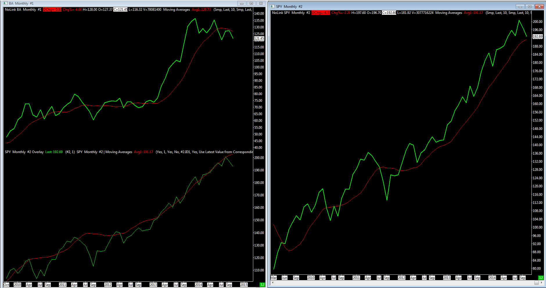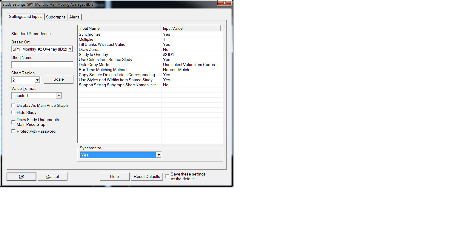 Dear Support: I want to overlay two stock symbols and their studies (simple moving averages) in one chart to do comparison. For prices overlay, I use "Overlay Bar" study. For study overlay, I use "Study/Price overlay" study. Please see the attached chart. On the left chart, the top region shows BA monthly line prices (based on close price) and its 10 period simple moving average. In the left chart bottom region, I overlay SPY monthly line prices from chart 2 (from right chart) and its 10 period simple moving average. As you can see the SPY simple moving average in the bottom region of the left chart does not match that in the right chart. Could you tell what might be wrong? Thanks very much. P.S. My Sierra Chart version is 1202. The setting of "Study/Price overlay" is shown in the second attachment file. Inside this chart, the "Study to Overlay" value is #2.ID1, where #2 is the right chart number for SPY symbol, and ID1 is its 10 period simple moving average. |