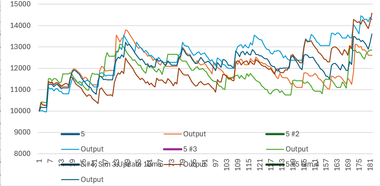 I have been working on an ASCIL script, and replaying the script on Sim accounts on Sierra to then backtest and collect trace activity data. My problem is that I will run the script on a set time, then run the script again, same start time, same duration, same instance of Sierra, same computer, yet I will get slightly different results, up to around 15% PnL deviation. My script runs intrabar. The script follows the same logic I want it to, but the entries and exits are slightly different, and often the trade count varies by a small amount. What multiple runs of the script would look like on a PnL graph would be very similar lines, yet they slowly diverge over time to produce different ending balances. Is this more likely a Sierra Chart error, code error, or something else? Has anyone else had this problem and solved it? Any tips? I'm very open to working together to solve this! If I left out any details pls ask. I attached the profit graphs of 5 of my backtests, same script, same computer, same start and end time, no changed settings. |