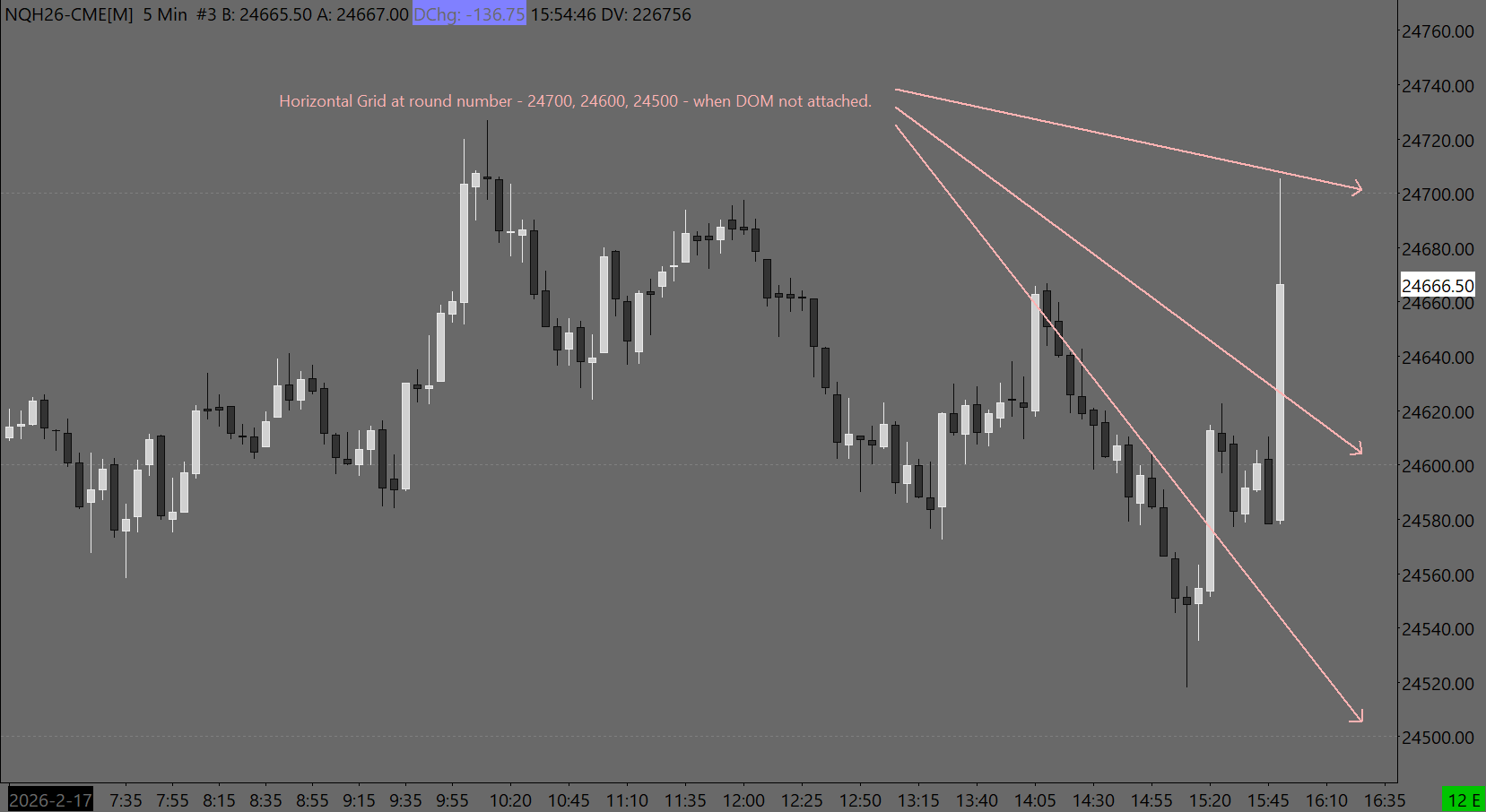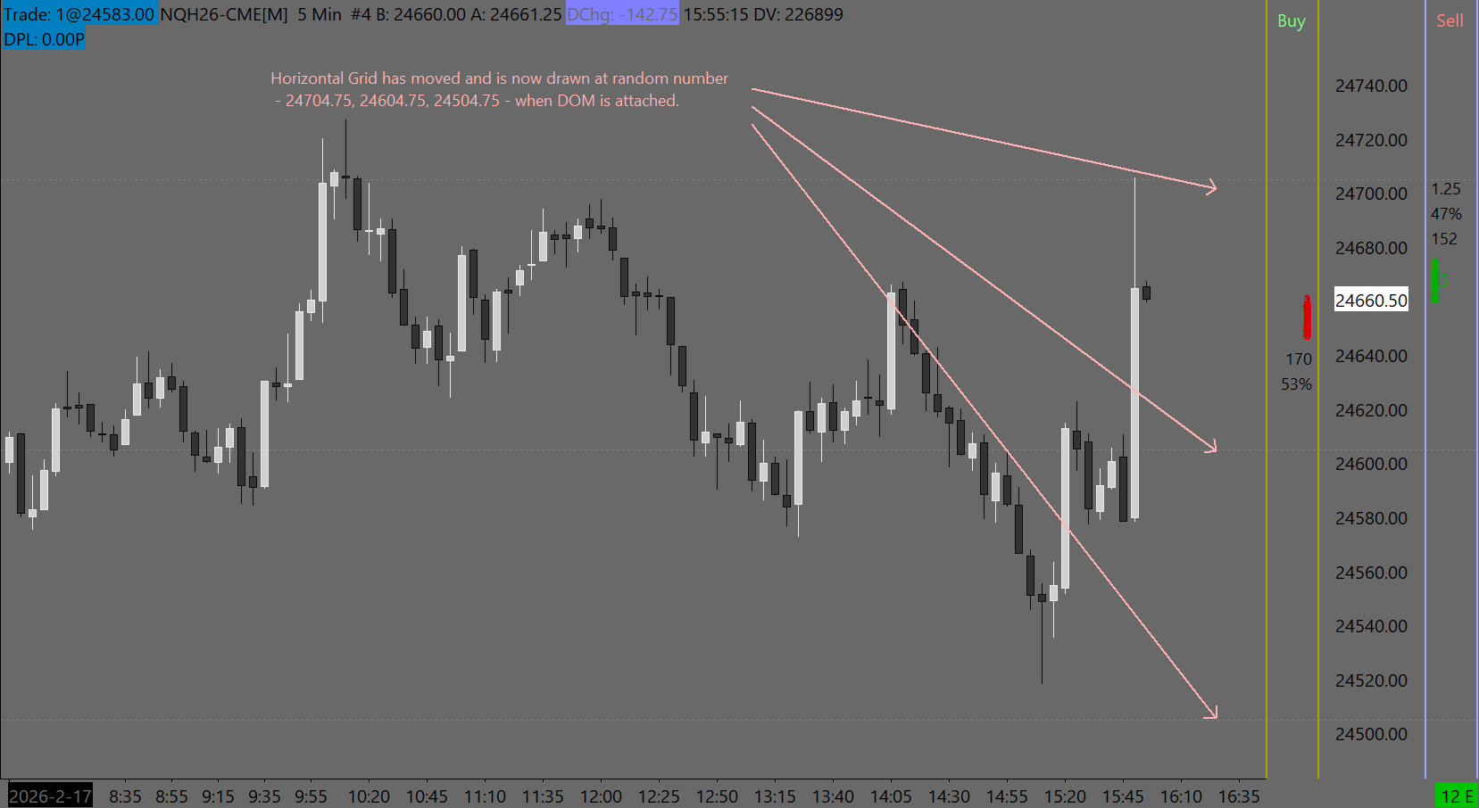 Hi there, When using the horizontal grid on a plain chart the lines appear at round numbers 24700, 24800, 24900 etc, but when you add the chart dom to the chart the lines are displayed at an odd random number 24704.50, 24804.50, 24904.50 etc. Do you know why that is and how to keep it at the round numbers. Grid is spaced at 100 points. See images: https://www.sierrachart.com/image.php?Image=1771264951611.png https://www.sierrachart.com/image.php?Image=177126500531.png |