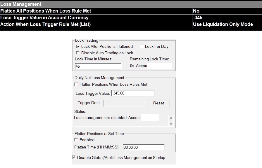 I need clarification once the Daily Loss Limit is triggered on my live account as I can't verify this on the sim account. If the 'Use Liquidation Only Mode' option from the Trade>>Trade Account Monitor>>User Profit/Loss Management is selected as displayed in the attached screenshot and I'm currently in a losing existing positions, will it be activated in the sense that it is only possible to reduce the quantity of existing positions. It is not possible to establish a new Position or increase the quantity of any existing Position? Based on the same attached image, is trade lock-out under Global Settings>>Global Profit/Loss Management possible for the liq only mode OR is that only possible with auto-liquidated (auto-flattened) positions OR when I reduce the quantity of existing position down to zero when daily net loss limit was triggered? Thanks for your reply in advance.
