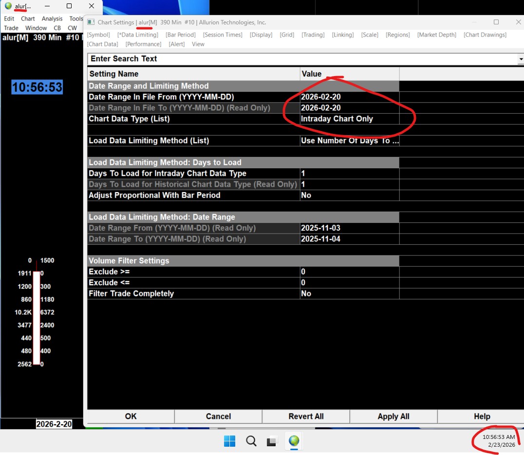 Hello Sierra Chart Support, I am experiencing an issue where my intraday charts are not updating to today’s date for certain symbols, primarily equities. Examples include ALUR In **Chart Settings → Data Limiting**, the chart shows: * “Date Range In File To” capped at **2026-02-20 (Read Only)** * Today’s data will not load or update beyond that date This behavior is **only occurring with small-cap tickers**. Large-cap symbols and other instruments appear to update normally. My platform is connected to the data feed, and reconnecting does not resolve the issue. Troubleshooting steps I have already tried: * Reconnected to the data feed * Used **Edit → Delete All Data and Download** * Verified Days to Load settings * Confirmed charts are not in Replay Mode Despite this, the affected symbols remain capped at 2026-02-20 and do not receive current intraday data. Could you please help me determine whether this is related to: * data feed permissions or exchange entitlements, * symbol routing/settings, * or another data limitation affecting small-cap equities? Please let me know if you need my current Data/Trade Service configuration or any additional diagnostics. Thank you for your help. Best regards, |