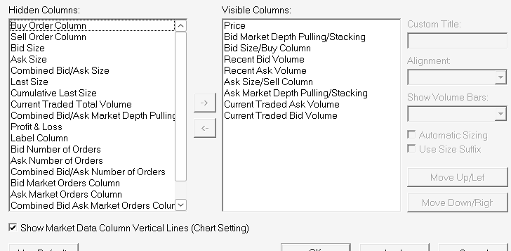 Hi, is that screenshot from Sierra Chart or from another platform? As far as I know, the Sierra Chart DOM doesn't have a built-in column that shows the Delta (Ask Volume minus Bid Volume) per price level. The columns available are things like Current Traded Bid Volume and Current Traded Ask Volume separately, but not a calculated difference column. If you're looking for Delta per price level, the Numbers Bars study (Footprint chart) can do that, it's a chart-based study, not a DOM feature. In the study settings, set the text type to "Ask Vol Bid Vol Difference". Documentation: Numbers Bars (see "Numbers Bars Text Types") Hope that helps point you in the right direction! |