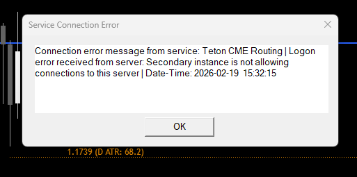 Dear Support Team, For a while, I have been receiving an attached error from the server. After this pop-up message emerges, Sierra gets connected on the following connection attempts. Just in case you ask, another Sierra Chart is not open on any other device. (as far as I know) Service Connection Error Connection error message from service: Teton CME Routing | Logon error received from server: Secondary instance is not allowing connections to this server | Date-Time: 2026-02-25 10:01:31 |