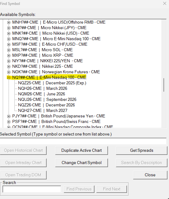 NQ?##-CME is not a valid symbol. That is the heading for that section of the NQ symbols. If you are wanting a Continuous Futures Contract chart, then refer to the following: Continuous Futures Contract Charts You can open charts for expired contracts. We just do not list all contracts in the Find Symbol window. You just need to enter the contract you want in the "Selected Symbol" field using the appropriate symbology for the service you are connected to. So for what you show, you would enter "NQH24-CME" to get the H 2024 contract for NQ. For the most reliable, advanced, and zero cost futures order routing, use the Teton service: Sierra Chart Teton Futures Order Routing |