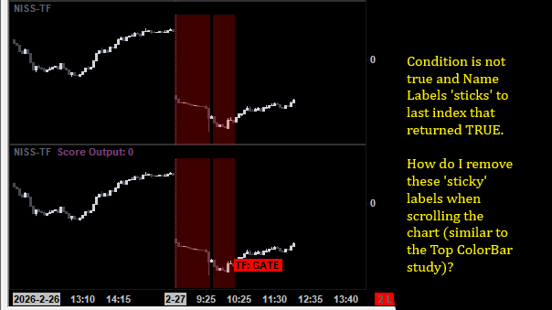 Hi Team, I've been digging through docs and support boards and have not found a solution, so I am posting here. I'm looking for a way to display a Subgraph Name Label ONLY on the lastVisibleIndex and remove old 'sticky' labels that remain visible next to the most recent index that drew the label. This is similar in functionality to the ColorBar Based on Alert Condition study when using DRAWSTYLE_SUBGRAPH_NAME_AND_VALUE_LABELS_ONLY. I've been able to workaround it once before using the following logic, but this doesn't seem the most efficient way to achieve the result. if (sc.Index == sc.ArraySize - 1) { if (sg_Score[sc.IndexOfLastVisibleBar] != 0) { sg_Tag.DrawStyle = DRAWSTYLE_SUBGRAPH_NAME_AND_VALUE_LABELS_ONLY; } else { sg_Tag.DrawStyle = DRAWSTYLE_IGNORE; } } New to ACSIL, so I recognize that the persistence may be a feature not a bug and inherent in the way I'm writing the code, so I've included the block below that populates the subgraph array: // Calculations logic... sg_Score[sc.Index] = CurrentScore; if (sc.HideStudy) return; // Stop here if hidden. if (CurrentScore != 0) { sg_Tag[sc.Index] = NISS_Array[sc.Index]; // Place Name Label at defined array value sg_Tag.DataColor[sc.Index] = (CurrentScore > 0) ? sg_Tag.PrimaryColor : sg_Tag.SecondaryColor; // Color Name Label } else { sg_Tag[sc.Index] = 0; } I've attached a couple screenshots for reference of what the 'sticky' label looks like. I can confirm I have sc.DrawZeros = 0 and have tried this with STD, LOW, and VERY_LOW precedence with no difference. Of course, this is trivial and I can opt to use a different drawstyle, but I've grown to like the visual effect of using DRAWSTYLE_SUBGRAPH_NAME_AND_VALUE_LABELS_ONLY with the ColorBar Alert study and only seeing the tag at the LastVisibleIndex when the condition returns TRUE. Any help is greatly appreciated. Gratefully, Jacob |