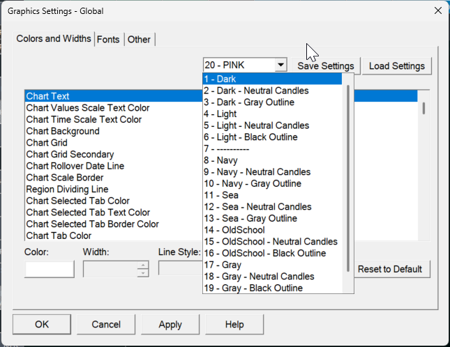 You have the select the "slot" you want to save to or load from in the pulldown to the left of those buttons. Then you are select the button to either "Save" or "Load" for that slot. The instructions for this are here: Graphics Settings: Saving and Loading Multiple Graphics Settings Configurations For the most reliable, advanced, and zero cost futures order routing, use the Teton service: Sierra Chart Teton Futures Order Routing |