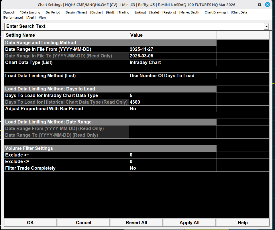 When you first open a chart for a symbol for which you have not received data previously, then the system is going to download the amount of data defined in "Global Settings >> Data/Trade Service Settings >> Common Settings >> Maximum Historical Days to Download >> Non-Tick Data [1 Tick Data]". Refer to the following: Data/Trade Service Settings: Maximum Historical Intraday Days to Download (Global Settings >> Data/Trade Service Settings >> Common Settings) For the most reliable, advanced, and zero cost futures order routing, use the Teton service: Sierra Chart Teton Futures Order Routing |