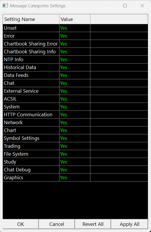 Thanks John. Everything was already set to "Yes" in Message Categories window and Trade Service log continues to remain blank.