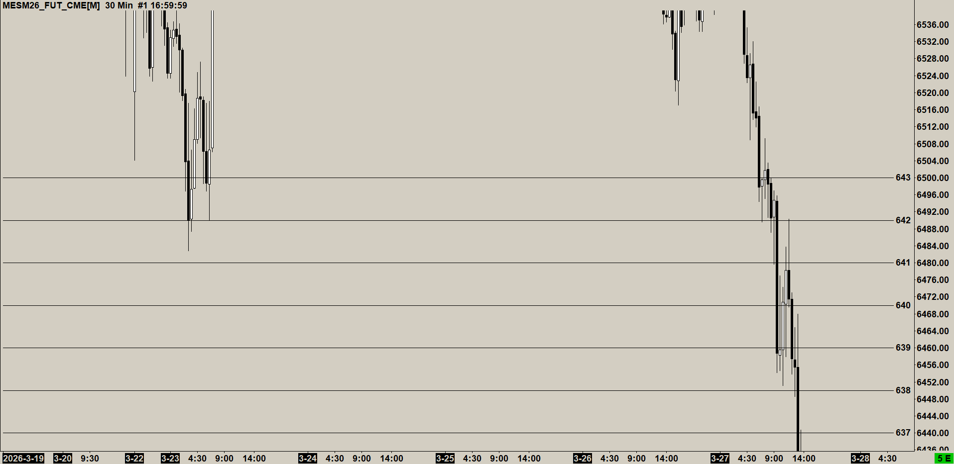 Hello Sierra Charts, Well done on a great software program. I've used it daily for a few months. I have a request for a tool that I believe futures traders would find very useful. If there's one that already exists that I'm not seeing please let me know. It's a Price Grid. Transposing the SPY price to futures price is easily done BUT marking all of those price levels, which change daily, on each chart is time-consuming and tedious. I use the 30,15,5 and 1 minute charts and a Price Grid tool would make it very, very much quicker and easier. The first price would be set at a chosen price on the futures chart. example: 675 at 6768.50 Then choose how many lines are in the Grid (the range). If 10 was chosen then there would be 10 lines above and 10 below the starting point. Then choose the distance between each line. 10 points in this example. All of these lines are locked together. When any given line in the grid is selected and moved all of the Grid lines also move correspondingly. Similar to the existing horizontal line tool, each line has independent text so the SPY price can be marked/indicated. Simply put, it's several lines locked together. Move one and it moves all. I don't know if requests and feedback are appropriate but thought I'd throw it out there. It would be sooooo nice to have this. I've attached a chart example. Thanks and have a good weekend. https://www.sierrachart.com/image.php?Image=1772843233532.png |