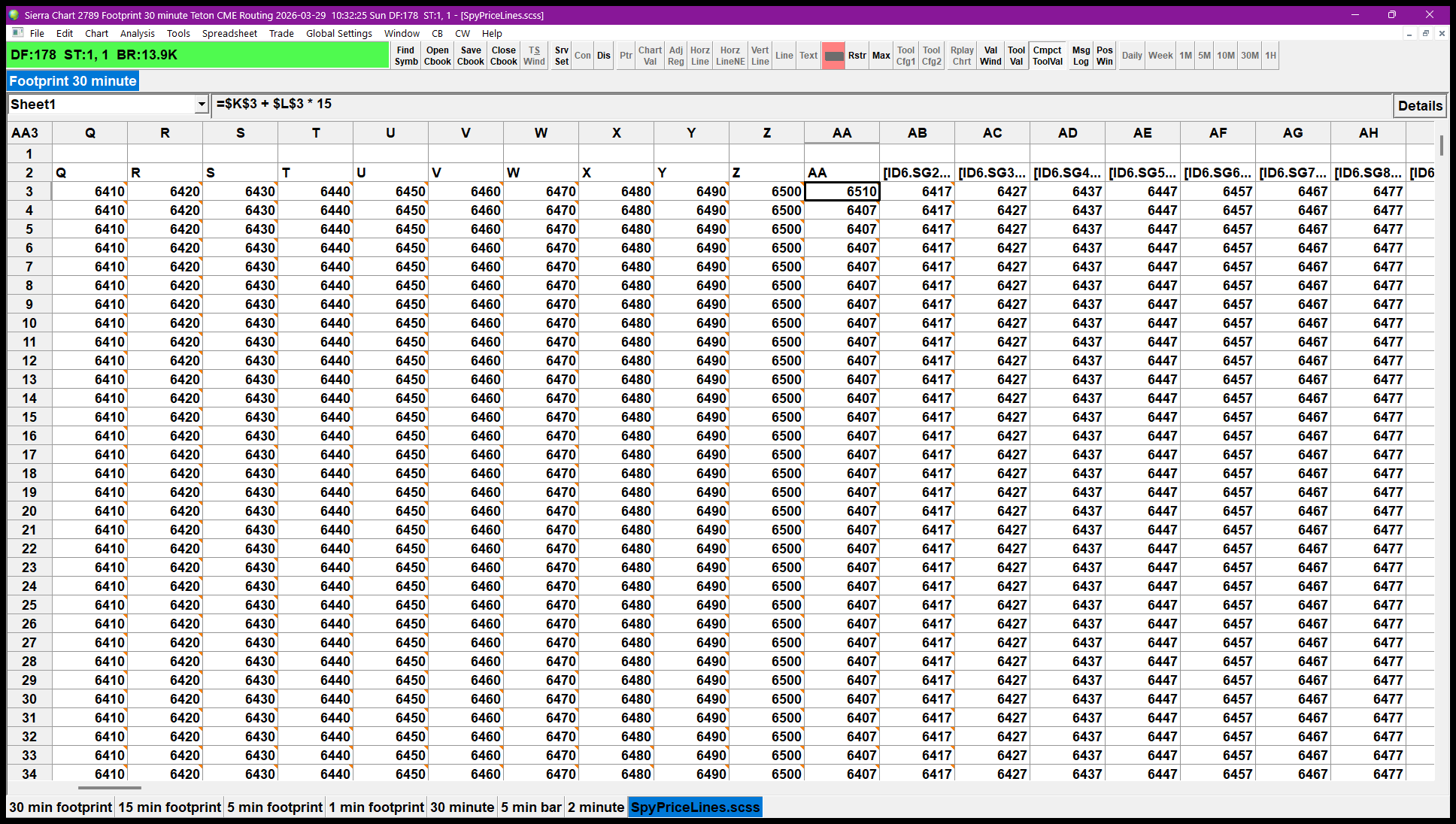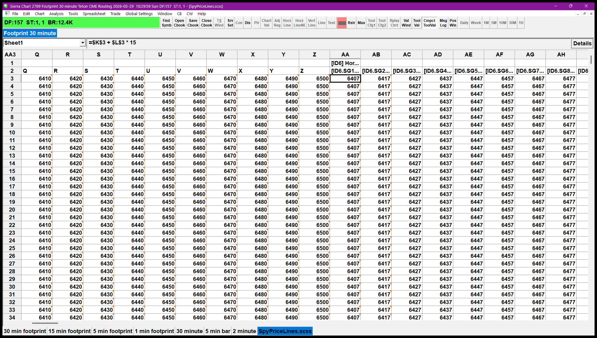 Hello John, This will work great.Thanks. I can get the numbers for columns K-Z but AA, AB etc aren't working for me. Can you tell me what I'm doing wrong, please? I appreciate it. https://www.sierrachart.com/image.php?Image=1774794552451.png https://www.sierrachart.com/image.php?Image=1774794601753.png When I delete the ID6 I can fill the cell with the formula (but not the whole column) but when I enter it into the Subgraph on the Study for the chart it changes the Spreadsheet back to ID6. https://www.sierrachart.com/image.php?Image=1774794747658.png Date Time Of Last Edit: 2026-03-29 14:35:12