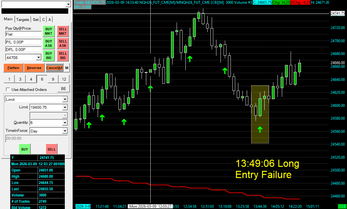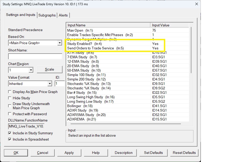 I tried to enable "SendOrdersToTradeService" in my custom trading study but trading was not allowed even though I have unchecked "Trade --> Trade Simulation On and the attached trading chart has been changed from a SIM account to my live account. Auto trading is enabled both globally and on the trade entry chart. Here is the exact message: 2026-03-09 13:49:06.447 | NQH26_FUT_CME[M]/MNQH26_FUT_CME [CB][M] 3000 Volume #3 | SendOrdersToTradeService is not consistent with 'Trade >> Trade Simulation Mode On' setting. Order action ignored. SendOrdersToTradeService=0, TradeSimulationModeOn=0 Here is the link to the uploaded screen shot of the chart: https://www.sierrachart.com/image.php?Image=1773081222184.png I am attaching a snippet of my code and a screen shot of the study inputs |