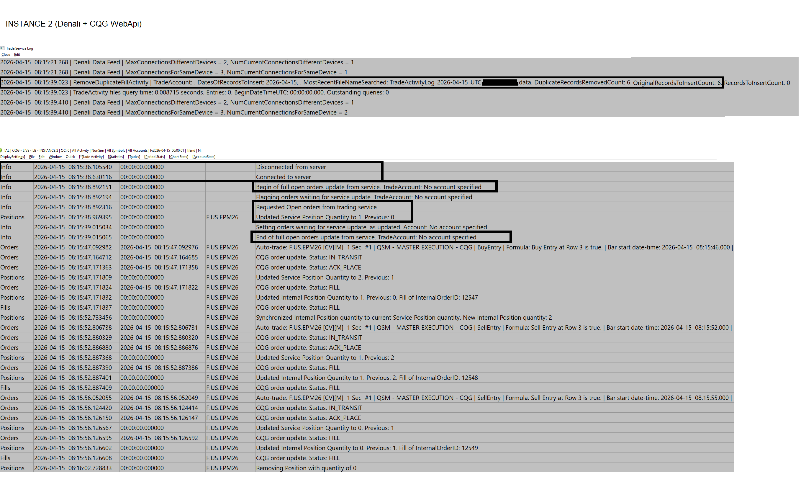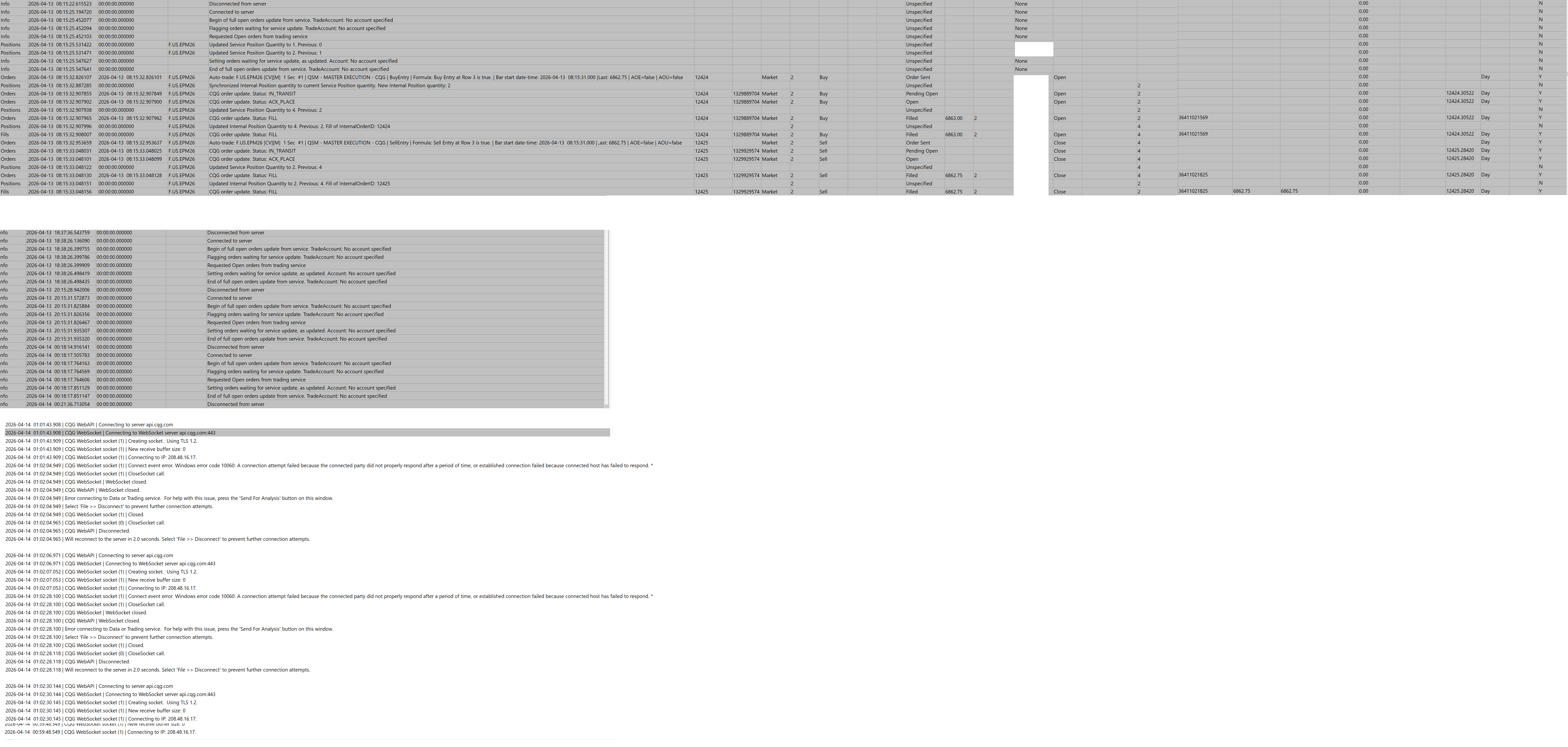 I restarted the machine, and all 3 Instances fresh. This is the loop that I am experiencing: Again, today exactly at 08:15am PST I got a forced disconnect from the server. Instance 1 - All live signals with Denali (it never dropped the connection at 08:15am PST). The strategy is +1. Instance 2 - using ACSIL custom study keeps updating +1 From Instance 1 into Instance 2. When Inst2 forced disconnect, somehow while it is reconnecting (under 1 minute) it sends live order +1 because it shows CQG server POS=0 (while disconnected), it fills +1 making new POS +2 (instead of desired +1). Now it reconnected, CQG shows +2 so Inst2 sends another -1 to finally match back to original +1. All this happens fast and everyday at 08:15am. Inst1 (Denali Sims ) - Did not disconnect Inst2 (Denali + CQG) - Forced disconnect - sending liver orders to match Inst1 strategy and overfills and then corrects with live orders. Inst3 (Denali + Teton) - Did not disconnect _ 1. I only have one connection to CQG WebApi at any time using INSTANCE 2. 2. I am already using TETON for one of the accounts with Phillip Capital. No issues here. 3. I am using CQG because I have private managed accounts with RJO and they only offer CQG at this time. 4. Today I did not get "too many connections error" from my machine. Last time it was trying the 4th connection. Restart helped I guess. I hope I can resolve this otherwise I would have to either: - Try DTC Server - Try running all 3 Instances on VPS - Try using 2 separate machines (not most desirable) - Execute via Phillip Cap and use giveups from Phillip to RJO accounts. Which of these would you recommend? Thank you again for your inputs. Date Time Of Last Edit: 2026-04-15 20:06:59
