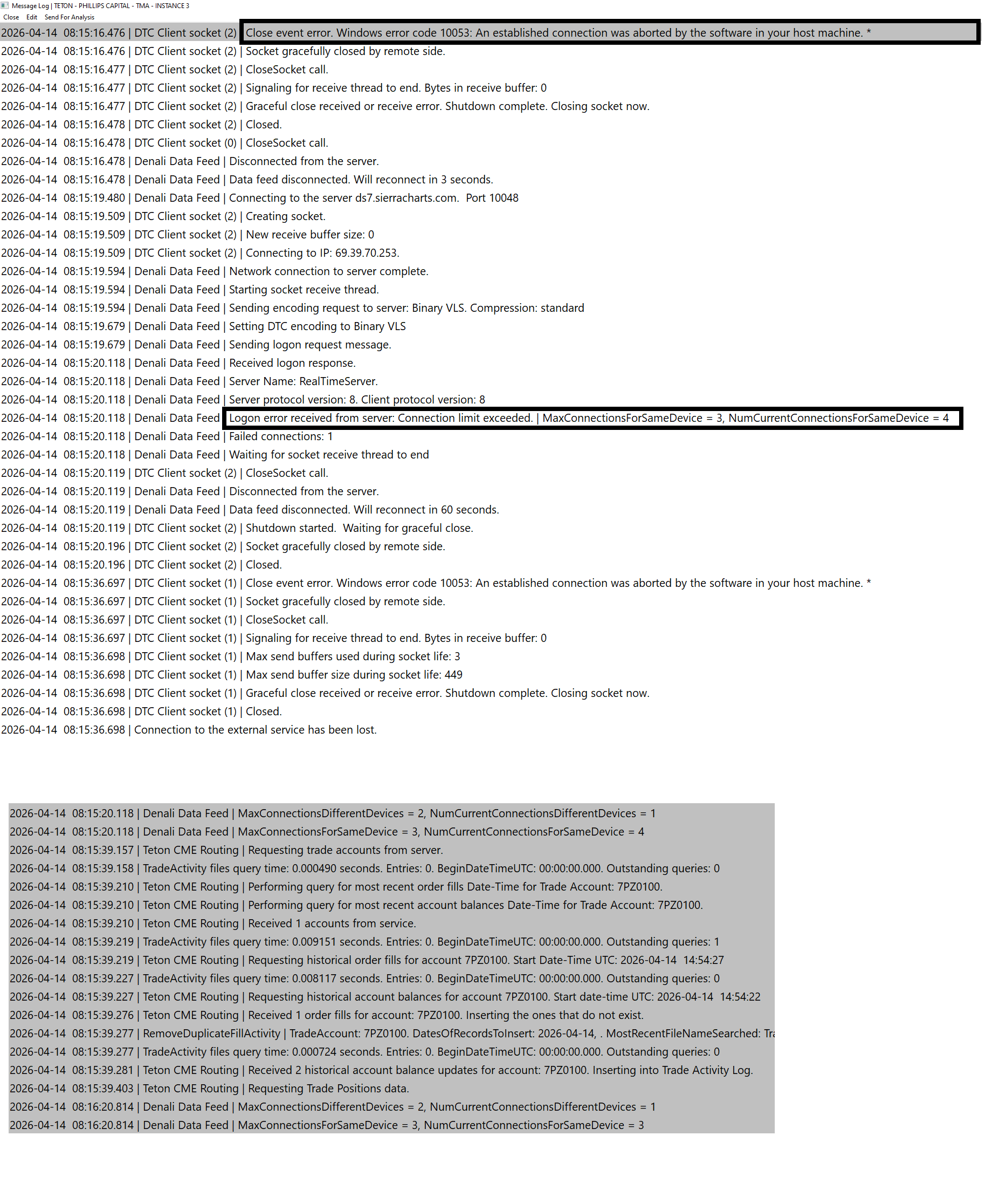 Thank you John, Trying to solve these disconnects. It also happened for me Teton connection on instance 3 today. Knowing how stable Denali+Teton is, please double check the error I got in the Message Log. It says: "Close event error. Windows error code 10053. An established connection was aborted by the software in your host machine" (see attached file) Is that affirmative that it was my machine or internet connection and not Denali nor CQG/Teton generated disconnects? I would like to isolate this issue and confirm the possible source so I can mitigate this. Also, got the error that my NumCurrentConnectionsForSameDevice=4 (see attached) I am only running 3 Instances on my machine: Instance 1 Denali - All Sims (no execution) Instance 2 Denali + CQG WebApi (RJO) Instance 3 Denali + Teton (Phillip Capital) Can my server disconnections at 10:15amCST be somehow causing these attempts to connect 4 times which is 1 too many on my account or could this forced 4th connection attempt be causing one of the other instances to disconnect? Please advise. Thank you very much. Date Time Of Last Edit: 2026-04-14 19:39:00