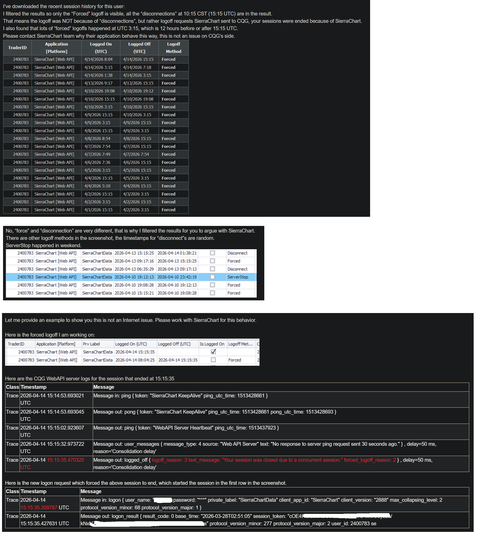 Thanks John, So I got a few more specific updates from CQG and although I understand you don't provide tech support for CQG, it sounds like the issue is either with SC trying to force another login making it too many at the time or my internet connection. CQG tech shows these logs, hoping you can help me decode and pinpoint exactly what is the reason I am getting these forced logoffs. It appears to be from SC side on my end. 1. I have shot down and restarted all 3 Instances of SC and will watch monitor for other forced logoff events 2. Do I need to make sure all 3 Instances are the same version/built of SC? Can I update the versions without loosing any data/settings/studies/spreadsheets if I changed all to newest version? 3. Based on the attached logs from CQG it looks to me like forced logoffs may be triggered by too many attempts to connect to a trading service and this error: "Your session was closed due to a concurrent session." forced_logoff_reason: 2 I hope attached logs could help in isolating what exactly causes these disconnects. Any help would be greatly appreciated. Regards. |