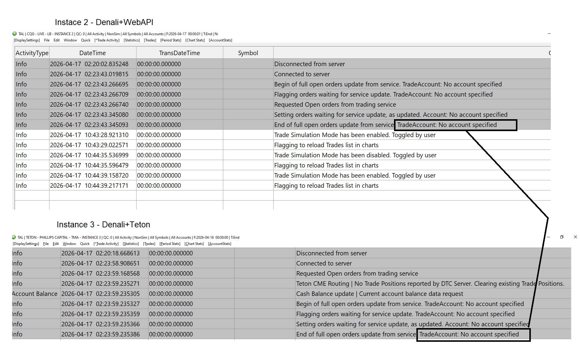 Today both Instances disconnected. Here are the TAL logs (attached). So it may not be CQG after all. 1. Based on the TAL log messages, can you confirm that such disconnection could be triggered by an internet connection? Also, can you confirm that the message log loop saying "No Account Specified" is normal? Another words when the disconnect/connected to server loop is finished the info from service log is connected even though TradeAccount account says: No Account specified. 2. Also, is it possible for Instance1 and Instance2 which communicates via Custom study can get disconnected and not auto reconnect during these disconnects loops? Today, after the reconnect it seems like Inst1 <> Inst2 Custom Study bridge stopped communicating. What do you recommend I can do to make sure custom Study refreshes or re-arms it-self after a reconnect loop if I am not by the machine to manually reset the ACSIL study or do I need to code something special for ACSCIL bridge to re-arm automatically? 3. If done correctly, shouldn't all Spreadsheets and all Custom Studies (ACSIL bridges) between all Instances reconnect to pre-disconnect state after an unattended auto disconnect/reconnect loops automatically? Thank you very much. Date Time Of Last Edit: 2026-04-17 18:25:22