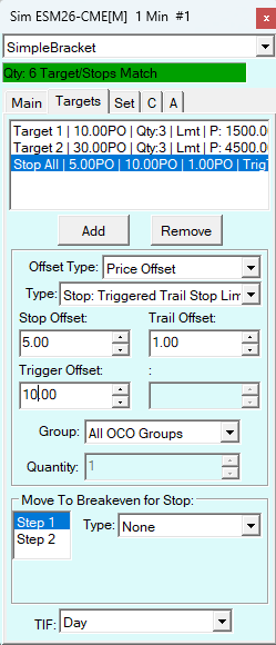 I've gone through your documentation and I'm still having trouble having success with 2 types of oco orders. #1. for example 6 contracts. 2 targets. target 1 10pts, target 2 30pts. Stop loss is same for all contracts. Target 1 is reached and 3 are sold and 3 contracts remain and go to B/E. then trail 1pt after target 1 reached and target 2 remains. #2. same 6 contracts stop loss for all contracts Target 1 10 pts 3 contracts off. target 2 20pts and 2 contracts off. remaining 1 contract trails 1 point after target 1 and trails 5pt after target 2 hits. last remain contract is manual exit. Lastly, sometimes when I have simple OCO bracket with two targets, sometimes there remains open OCO order after I'm flat. I'm unable to figure why this is happening? |