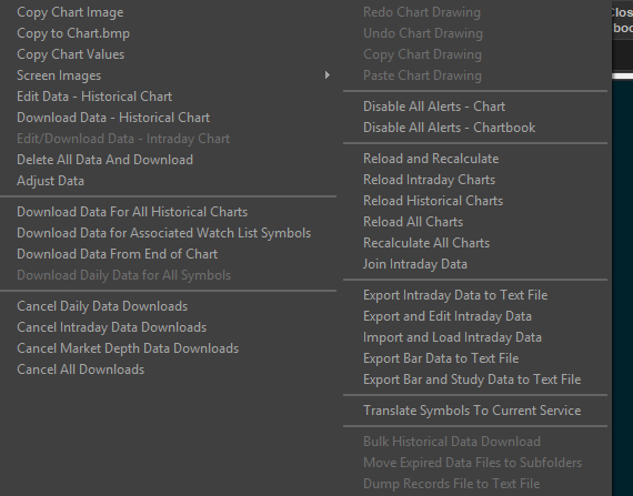 Can someone please inform me as why my charts no longer load intraday data? They will only show data from when sierra is opened. Historical data is working as intended. I have made sure.... chart settings - data limiting - days to load, is correct. I have also Delete and Download Data, Reload Intraday Charts, etc. 2026-04-02 12:56:12.091 | Trade activity files set size: 475 2026-04-02 12:56:12.101 | Rithmic Direct - DTC | Processed connection points. Count: 474 2026-04-02 12:56:12.163 | HTTPS connection ID:1 to downloads.rithmic.com:443 for request ID:1 (4) | Creating socket. Using TLS 1.2. 2026-04-02 12:56:12.163 | HTTPS connection ID:1 to downloads.rithmic.com:443 for request ID:1 (4) | New receive buffer size: 0 2026-04-02 12:56:12.163 | HTTPS connection ID:1 to downloads.rithmic.com:443 for request ID:1 (4) | Connecting to IP: 216.66.0.130. 2026-04-02 12:56:12.214 | Reading Internal Order ID file. 2026-04-02 12:56:12.215 | Reading Trade Orders file. 2026-04-02 12:56:12.215 | Reading Trade Positions file. 2026-04-02 12:56:12.215 | Reading Trade Account Data files. 2026-04-02 12:56:12.242 | Software version: 2803 64-bit 2026-04-02 12:56:12.242 | Primary Thread ID: 18036 2026-04-02 12:56:12.242 | Usage end date: 2026-04-26 2026-04-02 12:56:12.242 | Enabled for: Advanced Features 2. 2026-04-02 12:56:12.242 | Enabled for: Sierra Chart Historical Data Service. 2026-04-02 12:56:12.242 | Enabled for: Denali Real-Time Exchange Data Feed. 2026-04-02 12:56:12.242 | Enabled for: Delayed Denali Exchange Data Feed. 2026-04-02 12:56:12.242 | Allow Support for Sierra Chart Data Feeds is enabled. 2026-04-02 12:56:12.242 | Current selected Data/Trading service: Rithmic Direct - DTC 2026-04-02 12:56:12.242 | Custom symbol settings values: enabled 2026-04-02 12:56:12.242 | Chart Update Interval: 400 2026-04-02 12:56:12.242 | Intraday Data Storage Time Unit: 0 2026-04-02 12:56:12.242 | Time Zone: -07:00:00 (PST-08PDT+01,M3.2.0/02:00,M11.1.0/02:00) 2026-04-02 12:56:12.242 | 2026-04-02 19:56:12 Local computer time in UTC 2026-04-02 12:56:12.242 | 2026-04-02 12:56:12 Local computer time in SC Time Zone 2026-04-02 12:56:12.242 | 2026-04-02 19:56:10 Server time in UTC 2026-04-02 12:56:12.242 | Local computer UTC time and Server UTC time difference: 1 seconds. 2026-04-02 12:56:12.242 | Program path: C:\SierraChart\ 2026-04-02 12:56:12.242 | Data Files path: C:\SierraChart\Data\ 2026-04-02 12:56:12.242 | OS Version Number: 10.0 2026-04-02 12:56:12.242 | Locale Setting: C 2026-04-02 12:56:12.242 | Crash reporter started: true 2026-04-02 12:56:12.242 | 2026-04-02 12:56:12.260 | Checking for new symbol settings. Requested symbol settings MD5 for service code rithmic_v2.trading. Request ID: 1. 2026-04-02 12:56:12.286 | HTTPS connection ID:1 to login.sierrachart.com:443 for request ID:1 (1) | Shutdown started. Waiting for graceful close. 2026-04-02 12:56:12.375 | HTTPS connection ID:1 to login.sierrachart.com:443 for request ID:1 (1) | Socket gracefully closed by remote side. 2026-04-02 12:56:12.375 | HTTPS connection ID:1 to login.sierrachart.com:443 for request ID:1 (1) | Closed. 2026-04-02 12:56:12.559 | Received 5 login tokens. 2026-04-02 12:56:12.711 | Symbol settings MD5 received. Request ID: 1. 2026-04-02 12:56:12.711 | Symbol settings are up-to-date for rithmic_v2.trading. 2026-04-02 12:56:12.789 | Rithmic Direct - DTC | Wrote file: C:\SierraChart\RithmicConnections.json. Size: 110576 2026-04-02 12:56:12.790 | Rithmic Direct - DTC | Processed connection points. Count: 474 2026-04-02 12:56:13.042 | HTTPS connection ID:1 to downloads.rithmic.com:443 for request ID:1 (4) | CloseSocket call. 2026-04-02 12:56:13.042 | HTTPS connection ID:1 to downloads.rithmic.com:443 for request ID:1 (4) | Shutdown started. Waiting for graceful close. 2026-04-02 12:56:13.128 | HTTPS connection ID:1 to downloads.rithmic.com:443 for request ID:1 (4) | Socket gracefully closed by remote side. 2026-04-02 12:56:13.128 | HTTPS connection ID:1 to downloads.rithmic.com:443 for request ID:1 (4) | Closed. 2026-04-02 12:56:14.774 | Requested user files to download. 2026-04-02 12:56:16.767 | 2026-04-02 12:56:16.767 | Rithmic Direct - DTC | Using server connection: LucidTrading-Chicago Area-Non-Aggregated 2026-04-02 12:56:16.767 | Rithmic Direct - DTC | Trading server address/port: rsc.rithmic.com:50569 2026-04-02 12:56:16.769 | Rithmic Direct - DTC | Connecting to the server rsc.rithmic.com. Port 50569 2026-04-02 12:56:16.873 | DTC Client socket (1) | Creating socket. Using TLS 1.2. 2026-04-02 12:56:16.873 | DTC Client socket (1) | New receive buffer size: 0 2026-04-02 12:56:16.873 | DTC Client socket (1) | Connecting to IP: 208.97.247.101. 2026-04-02 12:56:16.940 | Rithmic Direct - DTC | Network connection to server complete. 2026-04-02 12:56:16.940 | Rithmic Direct - DTC | Starting socket receive thread. 2026-04-02 12:56:16.940 | Rithmic Direct - DTC | Using fixed encoding of Binary 2026-04-02 12:56:16.940 | Rithmic Direct - DTC | Sending logon request message. 2026-04-02 12:56:17.144 | Rithmic Direct - DTC | Received logon response. 2026-04-02 12:56:17.144 | Rithmic Direct - DTC | Server Name: . 2026-04-02 12:56:17.144 | Rithmic Direct - DTC | Server protocol version: 8. Client protocol version: 8 2026-04-02 12:56:17.144 | Rithmic Direct - DTC | Successfully connected. 2026-04-02 12:56:17.144 | Rithmic Direct - DTC | Trading is supported. 2026-04-02 12:56:17.144 | Rithmic Direct - DTC | Order cancel and replace is supported. 2026-04-02 12:56:17.144 | Rithmic Direct - DTC | OCO Orders supported. 2026-04-02 12:56:17.144 | Rithmic Direct - DTC | Symbol and Exchange Delimiter: . 2026-04-02 12:56:17.144 | Rithmic Direct - DTC | MarketDepthIsSupported: 0 2026-04-02 12:56:17.144 | Rithmic Direct - DTC | Connection to server complete. 2026-04-02 12:56:17.145 | No download requests in the queue to start downloads for. | Number times message added: 3 2026-04-02 12:56:19.981 | Files to Open on Startup | Opening file: Chartbook3.Cht 2026-04-02 12:56