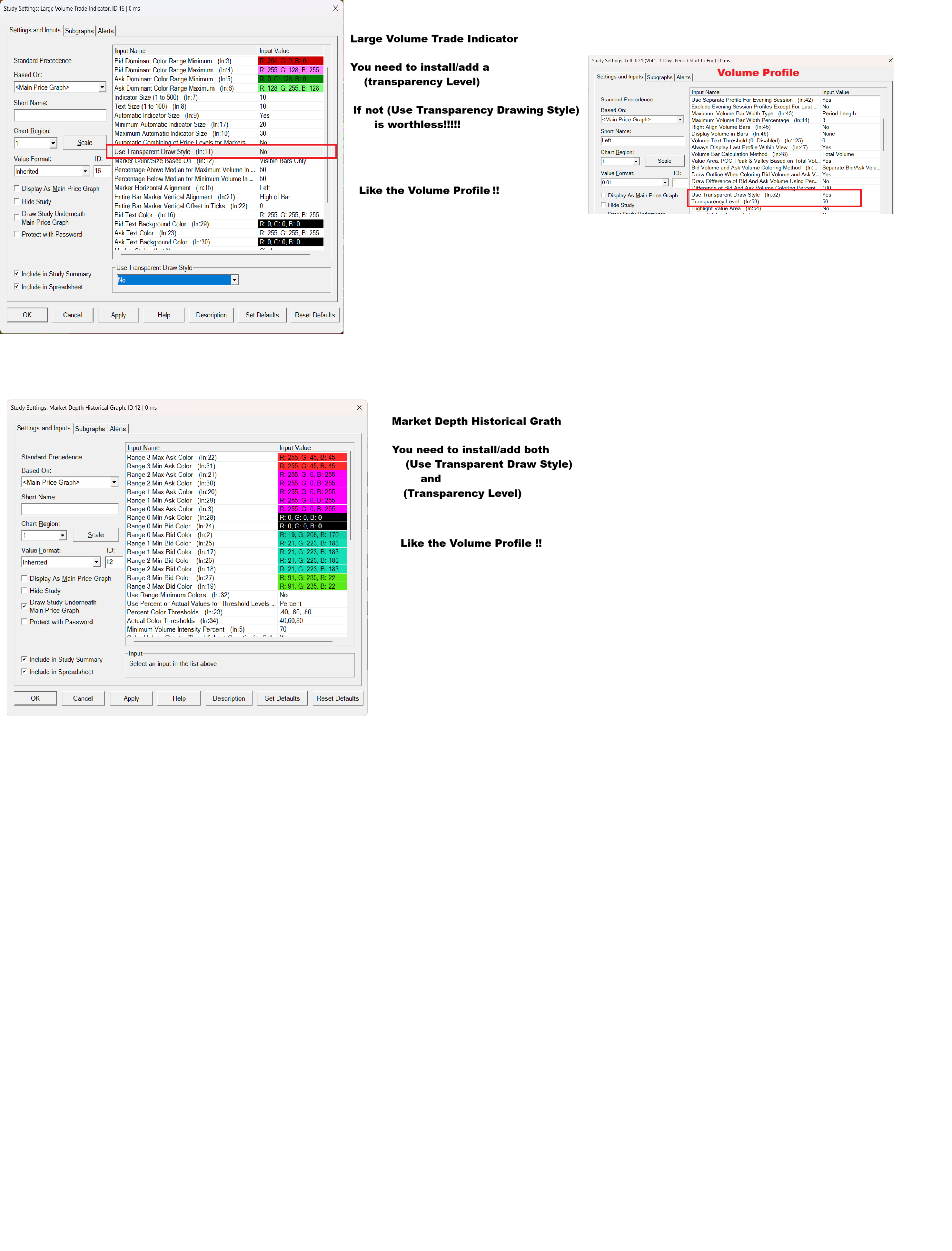 I need help with these 2 indicators. I'm not sure how to do this Large Volume Trade Indicator has a (Use Transparency Drawing Style) but it's worthless if it doesn't have a (transparency level) option Plus Market Depth Historical Grath Needs both (Use Transparency Drawing Style) (transparency level) Like you guys have it on (Volume Profile) I sent you a screenshot that has all three Best wishes to all, Joe V |