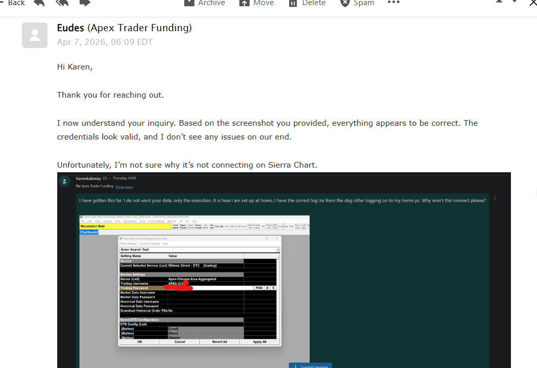 mate, you know I have done all of this, step by step, and still it won't connect. I have googled and watched every video I can find and I have done exactly what your written, and their video steps say to. I don't get it as I am connected at home on my pc no issue, but I can't get this laptop to connect. You had me send you the message log, did that tell you anything? Here it is again. I swear on my dog's life I have done every step in every info you have, apex has, and on you tube. Karen 2026-04-07 15:59:28.828 | Trade activity files set size: 1 2026-04-07 15:59:28.836 | Rithmic Direct - DTC | Processed connection points. Count: 496 2026-04-07 15:59:28.879 | Reading Internal Order ID file. 2026-04-07 15:59:28.880 | Reading Trade Orders file. 2026-04-07 15:59:28.880 | Reading Trade Positions file. 2026-04-07 15:59:28.880 | Reading Trade Account Data files. 2026-04-07 15:59:28.886 | Software version: 2891 64-bit 2026-04-07 15:59:28.886 | Primary Thread ID: 29848 2026-04-07 15:59:28.886 | Usage end date: 2026-05-01 2026-04-07 15:59:28.886 | Enabled for: Advanced Features 2. 2026-04-07 15:59:28.886 | Enabled for: Sierra Chart Historical Data Service. 2026-04-07 15:59:28.886 | Enabled for: Denali Real-Time Exchange Data Feed. 2026-04-07 15:59:28.886 | Enabled for: Delayed Denali Exchange Data Feed. 2026-04-07 15:59:28.886 | Enabled for exchange2: CME (Trading Account Required) 2026-04-07 15:59:28.886 | Enabled for exchange2: CBOT (Trading Account Required) 2026-04-07 15:59:28.886 | Enabled for exchange2: COMEX (Trading Account Required) 2026-04-07 15:59:28.886 | Enabled for exchange2: NYMEX (Trading Account Required) 2026-04-07 15:59:28.886 | Enabled for exchange2: CBOE Global Indexes 2026-04-07 15:59:28.886 | Allow Support for Sierra Chart Data Feeds is enabled. 2026-04-07 15:59:28.886 | Current selected Data/Trading service: Rithmic Direct - DTC 2026-04-07 15:59:28.886 | Custom symbol settings values: enabled 2026-04-07 15:59:28.886 | Chart Update Interval: 400 2026-04-07 15:59:28.886 | Intraday Data Storage Time Unit: 0 2026-04-07 15:59:28.886 | Time Zone: +00:00:00 (UTC+00) 2026-04-07 15:59:28.886 | 2026-04-07 15:59:28 Local computer time in UTC 2026-04-07 15:59:28.886 | 2026-04-07 15:59:28 Local computer time in SC Time Zone 2026-04-07 15:59:28.886 | 2026-04-07 15:59:25 Server time in UTC 2026-04-07 15:59:28.886 | Local computer UTC time and Server UTC time difference: 3 seconds. 2026-04-07 15:59:28.886 | Program path: C:\rythmic\ 2026-04-07 15:59:28.886 | Data Files path: C:\rythmic\Data\ 2026-04-07 15:59:28.886 | OS Version Number: 10.0 2026-04-07 15:59:28.886 | Locale Setting: C 2026-04-07 15:59:28.886 | Crash reporter started: true 2026-04-07 15:59:28.886 | 2026-04-07 15:59:28.905 | HTTPS connection ID:1 to downloads.rithmic.com:443 for request ID:1 (4) | Creating socket. Using TLS 1.2. 2026-04-07 15:59:28.905 | HTTPS connection ID:1 to downloads.rithmic.com:443 for request ID:1 (4) | New receive buffer size: 0 2026-04-07 15:59:28.905 | HTTPS connection ID:1 to downloads.rithmic.com:443 for request ID:1 (4) | Connecting to IP: 38.79.0.89. 2026-04-07 15:59:28.911 | Checking for new symbol settings. Requested symbol settings MD5 for service code rithmic_v2.trading. Request ID: 1. 2026-04-07 15:59:28.913 | HTTPS connection ID:1 to login.sierrachart.com:443 for request ID:1 (1) | Shutdown started. Waiting for graceful close. 2026-04-07 15:59:28.948 | HTTPS connection ID:1 to login.sierrachart.com:443 for request ID:1 (1) | Socket gracefully closed by remote side. 2026-04-07 15:59:28.948 | HTTPS connection ID:1 to login.sierrachart.com:443 for request ID:1 (1) | Closed. 2026-04-07 15:59:29.049 | Received 5 login tokens. 2026-04-07 15:59:29.138 | Symbol settings MD5 received. Request ID: 1. 2026-04-07 15:59:29.138 | Symbol settings are up-to-date for rithmic_v2.trading. 2026-04-07 15:59:29.235 | HTTPS connection ID:1 to downloads.rithmic.com:443 for request ID:1 (4) | Socket gracefully closed by remote side. | Number times message added: 1 2026-04-07 15:59:29.235 | Rithmic Direct - DTC | Wrote file: C:\rythmic\RithmicConnections.json. Size: 115600 2026-04-07 15:59:29.236 | Rithmic Direct - DTC | Processed connection points. Count: 496 2026-04-07 15:59:29.236 | HTTPS connection ID:1 to downloads.rithmic.com:443 for request ID:1 (4) | CloseSocket call. 2026-04-07 15:59:29.236 | HTTPS connection ID:1 to downloads.rithmic.com:443 for request ID:1 (4) | Graceful close received or receive error. Shutdown complete. Closing socket now. 2026-04-07 15:59:29.236 | HTTPS connection ID:1 to downloads.rithmic.com:443 for request ID:1 (4) | Closed. 2026-04-07 15:59:31.433 | Requested user files to download. 2026-04-07 15:59:31.736 | File to download: prop_alpha_pro_vanta_studies_64.dll. Action: 1 2026-04-07 15:59:31.738 | File to download: prop_alpha_pro_64.dll. Action: 1 2026-04-07 15:59:31.749 | File to download: prop_alpha_basic_vanta_studies_64.dll. Action: 1 2026-04-07 15:59:31.751 | File to download: prop_alpha_fvg_64.dll. Action: 1 2026-04-07 15:59:31.753 | File to download: prop_alpha_basic_64.dll. Action: 1 2026-04-07 15:59:31.758 | File to download: prop_alpha_gelber_64.dll. Action: 1 2026-04-07 15:59:31.760 | File to download: bduffy_kk_64.dll. Action: 1 2026-04-07 15:59:31.762 | File to download: kk_lvls_64.dll. Action: 1 2026-04-07 15:59:31.764 | User files to download complete 2026-04-07 15:59:33.449 | 2026-04-07 15:59:33.449 | Rithmic Direct - DTC | Using server connection: Apex-Chicago Area-Non-Aggregated 2026-04-07 15:59:33.449 | Rithmic Direct - DTC | Trading server address/port: rsc.rithmic.com:50528 2026-04-07 15:59:33.449 | Rithmic Direct - DTC | Connecting to the server rsc.rithmic.com. Port 50528 2026-04-07 15:59:33.475 | DTC Client socket (1) | Creating socket. Using TLS 1.2. 2026-04-07 15:59:33.475 | DTC Client socket (1) | New receive buffer size: 0 2026-04-07 15:59:33.475 | DTC Client socket (1) | Connecting to IP: 184.105.22.231. 2026-04-07 15:59:33.506 | Rithmic Direct - DTC 