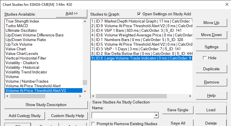 What you are stating does not make any sense. When a chart updates, all the studies update. So you would not have one study that is updated and another study that is not. Additionally, how could you tell that the studies are lagging by 300 milliseconds (1/3 of one second). This would be impossible to tell with the human eye. You may notice something, but you could not possibly know that it is something that specific. The one thing that could be occurring is that the graphics updating is not happening as fast due to a large graphics load. In this case, you should try to simplify your charts in order to ensure that the information is being drawn quickly enough for you. Although your computer and graphics card will also have a part to play in this particular issue. Refer to the following for all the ways you can improve performance for Sierra Chart: High CPU Usage | Inactive User Interface | Poor Performance | Long Time to Load Chart Data | Charts Reloading Often For the most reliable, advanced, and zero cost futures order routing, use the Teton service: Sierra Chart Teton Futures Order Routing |